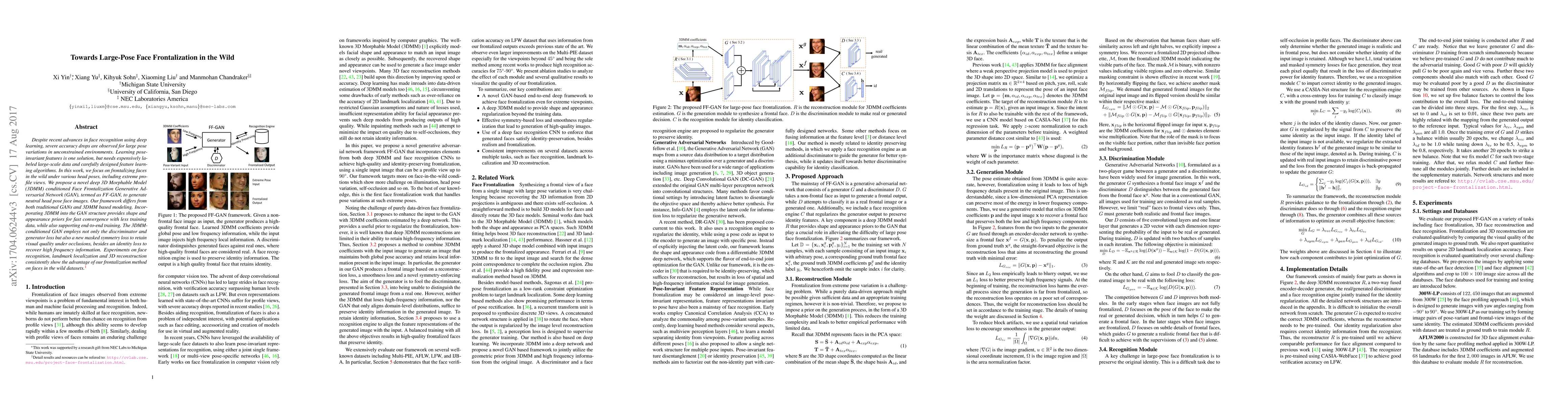 This paper proposes a novel FF-GAN framework that integrates a deep 3D Morphable Model (3DMM) with a GAN to frontalize faces under various head poses, including extreme profiles. The method achieves fast convergence with less data and retains visual quality through a masked symmetry loss, demonstrating improved performance in face recognition, landmark localization, and 3D reconstruction.
