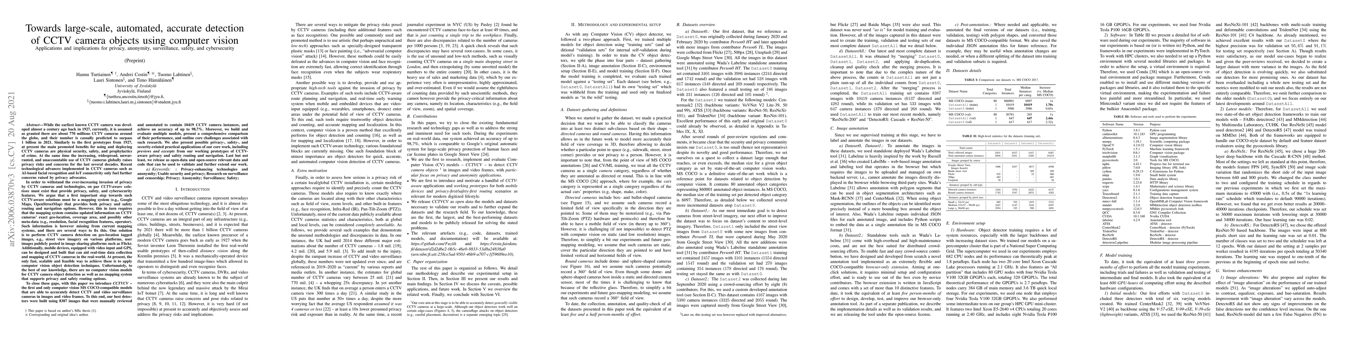 In order to withstand the ever-increasing invasion of privacy by CCTV cameras and technologies, on par CCTV-aware solutions must exist that provide privacy, safety, and cybersecurity features. We argue that a first important step towards such CCTV-aware solutions must be a mapping system (e.g., Google Maps, OpenStreetMap) that provides both privacy and safety routing and navigation options. However, this in turn requires that the mapping system contains updated information on CCTV cameras' exact geo-location, coverage area, and possibly other meta-data (e.g., resolution, facial recognition features, operator). Such information is however missing from current mapping systems, and there are several ways to fix this. One solution is to perform CCTV camera detection on geo-location tagged images, e.g., street view imagery on various platforms, user images publicly posted in image sharing platforms such as Flickr. Unfortunately, to the best of our knowledge, there are no computer vision models for CCTV camera object detection as well as no mapping system that supports privacy and safety routing options. To close these gaps, with this paper we introduce CCTVCV -- the first and only computer vision MS COCO-compatible models that are able to accurately detect CCTV and video surveillance cameras in images and video frames. To this end, our best detectors were built using 8387 images that were manually reviewed and annotated to contain 10419 CCTV camera instances, and achieve an accuracy of up to 98.7%. Moreover, we build and evaluate multiple models, present a comprehensive comparison of their performance, and outline core challenges associated with such research.