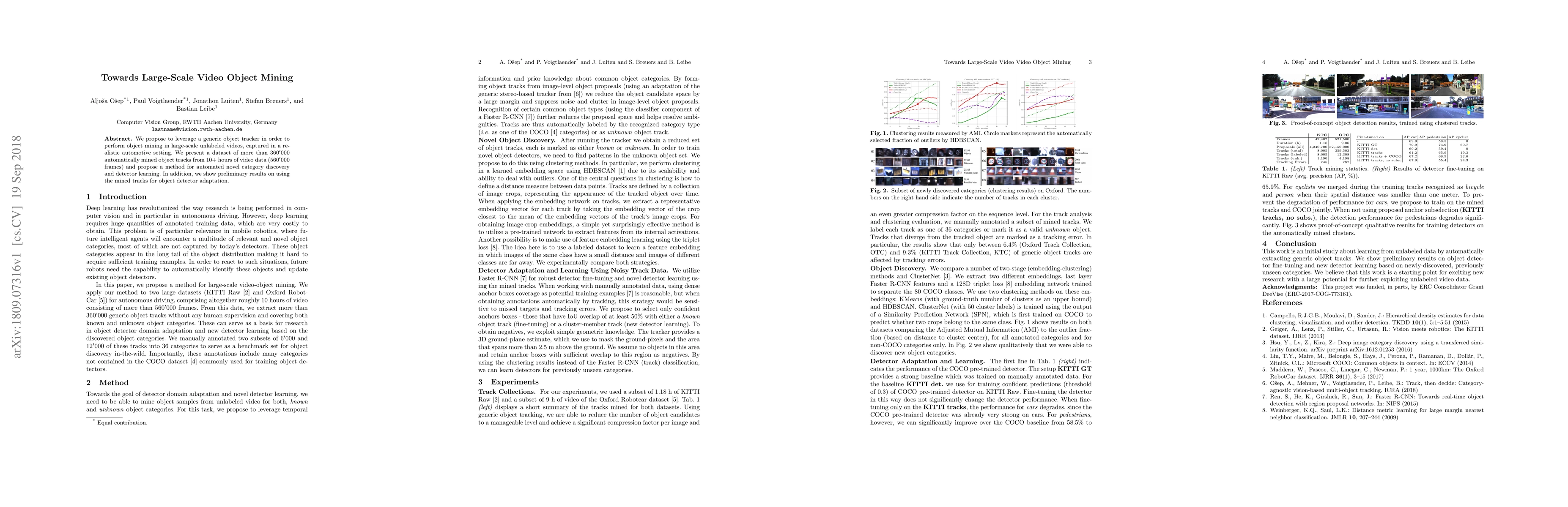 This paper introduces a method for large-scale video object mining using a generic object tracker in automotive videos, presenting a dataset of over 360,000 mined object tracks. It also proposes techniques for automated novel category discovery and detector learning, along with preliminary results on object detector adaptation.