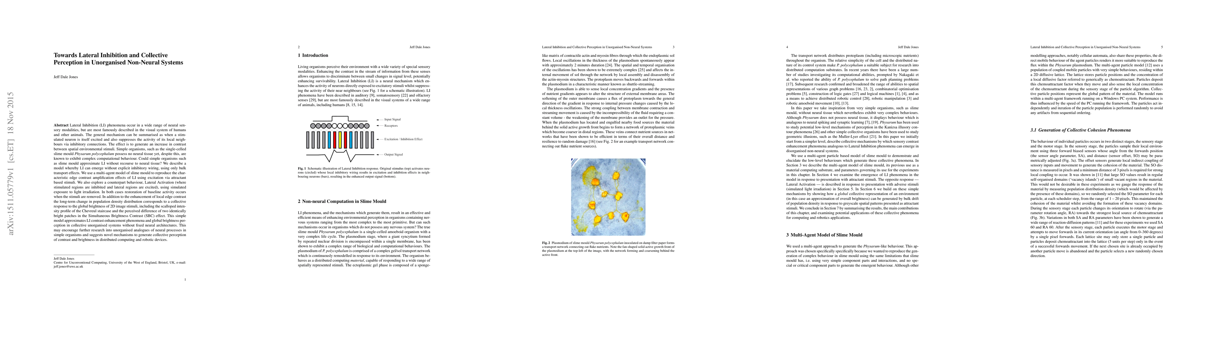 Could simple organisms such as slime mould approximate LI without recourse to neural tissue? We describe a model whereby LI can emerge without explicit inhibitory wiring, using only bulk transport effects. We use a multi-agent model of slime mould to reproduce the char- acteristic edge contrast amplification effects of LI using excitation via attractant based stimuli. We also explore a counterpart behaviour, Lateral Activation (where stimulated regions are inhibited and lateral regions are excited), using simulated exposure to light irradiation. In both cases restoration of baseline activity occurs when the stimuli are removed. In addition to the enhancement of local edge contrast the long-term change in population density distribution corresponds to a collective response to the global brightness of 2D image stimuli, including the scalloped inten- sity profile of the Chevreul staircase and the perceived difference of two identically bright patches in the Simultaneous Brightness Contrast (SBC) effect. This simple modelapproximatesLIcontrastenhancementphenomenaandglobalbrightnessper- ception in collective unorganised systems without fixed neural architectures. This may encourage further research into unorganised analogues of neural processes in simple organisms and suggests novel mechanisms to generate collective perception of contrast and brightness in distributed computing and robotic devices.