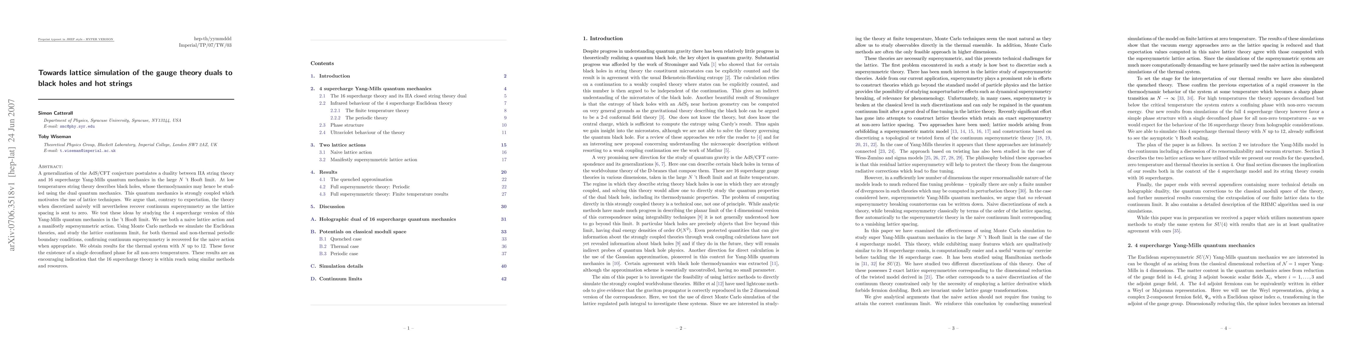 A generalization of the AdS/CFT conjecture postulates a duality between IIA string theory and 16 supercharge Yang-Mills quantum mechanics in the large N 't Hooft limit. At low temperatures string theory describes black holes, whose thermodynamics may hence be studied using the dual quantum mechanics. This quantum mechanics is strongly coupled which motivates the use of lattice techniques. We argue that, contrary to expectation, the theory when discretized naively will nevertheless recover continuum supersymmetry as the lattice spacing is sent to zero. We test these ideas by studying the 4 supercharge version of this Yang-Mills quantum mechanics in the 't Hooft limit. We use both a naive lattice action and a manifestly supersymmetric action. Using Monte Carlo methods we simulate the Euclidean theories, and study the lattice continuum limit, for both thermal and non-thermal periodic boundary conditions, confirming continuum supersymmetry is recovered for the naive action when appropriate. We obtain results for the thermal system with N up to 12. These favor the existence of a single deconfined phase for all non-zero temperatures. These results are an encouraging indication that the 16 supercharge theory is within reach using similar methods and resources.