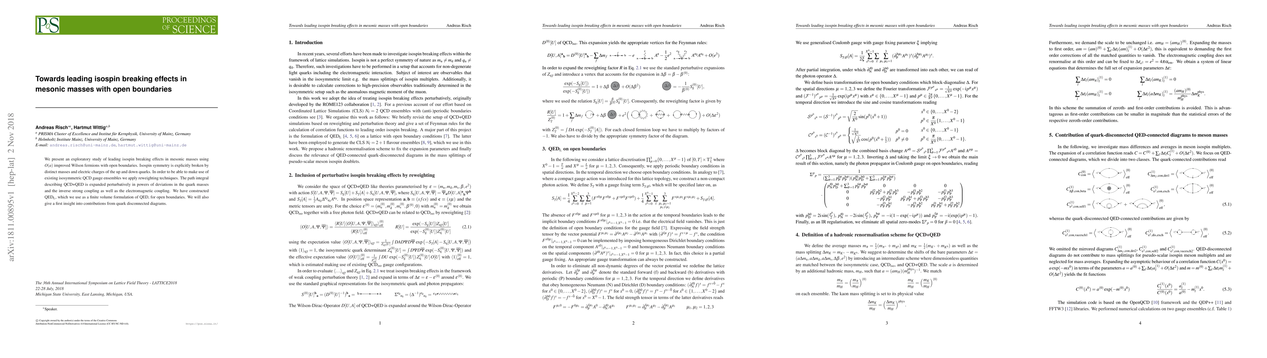 This study explores leading isospin breaking effects in mesonic masses using $O(a)$ improved Wilson fermions with open boundaries, employing reweighting techniques to utilize existing isosymmetric QCD gauge ensembles. The research introduces QED$_{\mathrm{L}}$ for open boundaries and provides initial insights into contributions from quark disconnected diagrams.