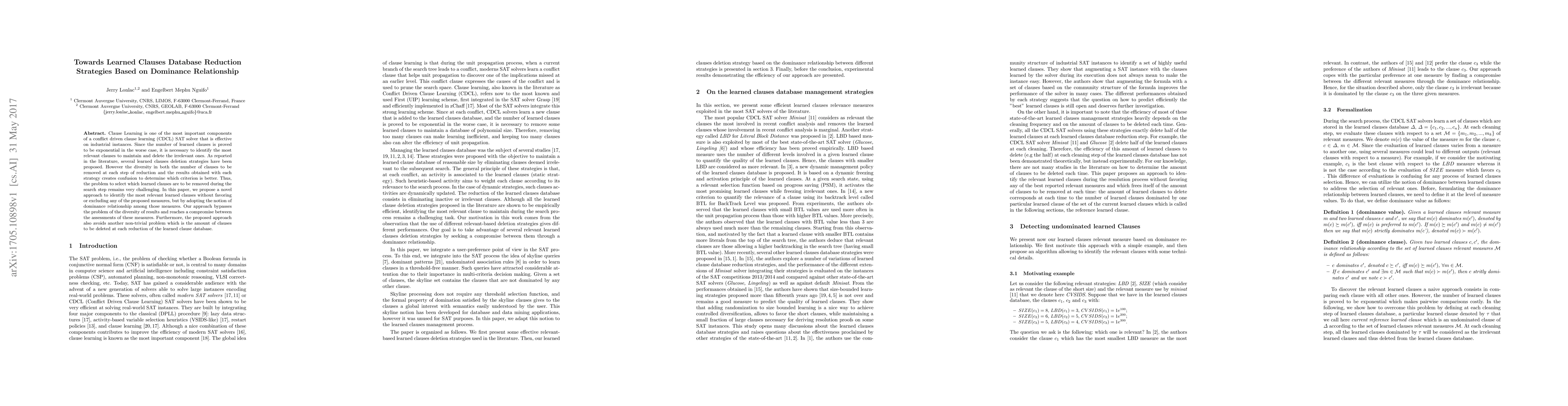 This paper proposes a novel method for reducing the learned clauses database in SAT solvers by identifying the most relevant clauses based on a dominance relationship among various relevance measures. The approach aims to overcome the diversity in results from different deletion strategies and avoids the issue of determining the number of clauses to delete at each reduction step.