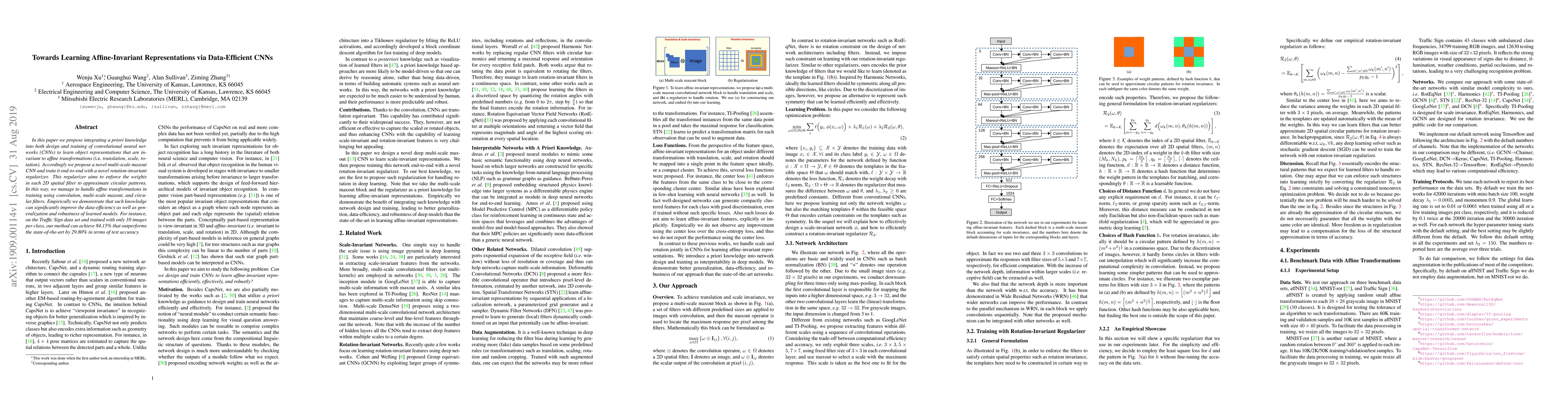 In this paper we propose integrating a priori knowledge into both design and training of convolutional neural networks (CNNs) to learn object representations that are invariant to affine transformations (i.e., translation, scale, rotation). Accordingly we propose a novel multi-scale maxout CNN and train it end-to-end with a novel rotation-invariant regularizer. This regularizer aims to enforce the weights in each 2D spatial filter to approximate circular patterns. In this way, we manage to handle affine transformations in training using convolution, multi-scale maxout, and circular filters. Empirically we demonstrate that such knowledge can significantly improve the data-efficiency as well as generalization and robustness of learned models. For instance, on the Traffic Sign data set and trained with only 10 images per class, our method can achieve 84.15% that outperforms the state-of-the-art by 29.80% in terms of test accuracy.