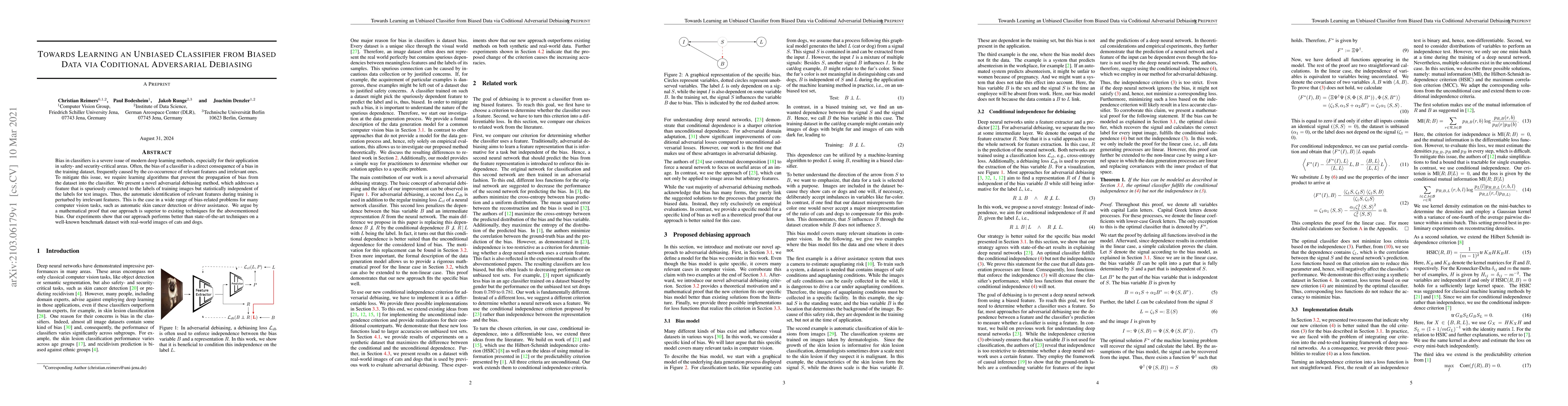 Researchers propose a method to create unbiased classifiers from biased data using conditional adversarial debiasing, outperforming existing techniques on a real-world image classification benchmark.