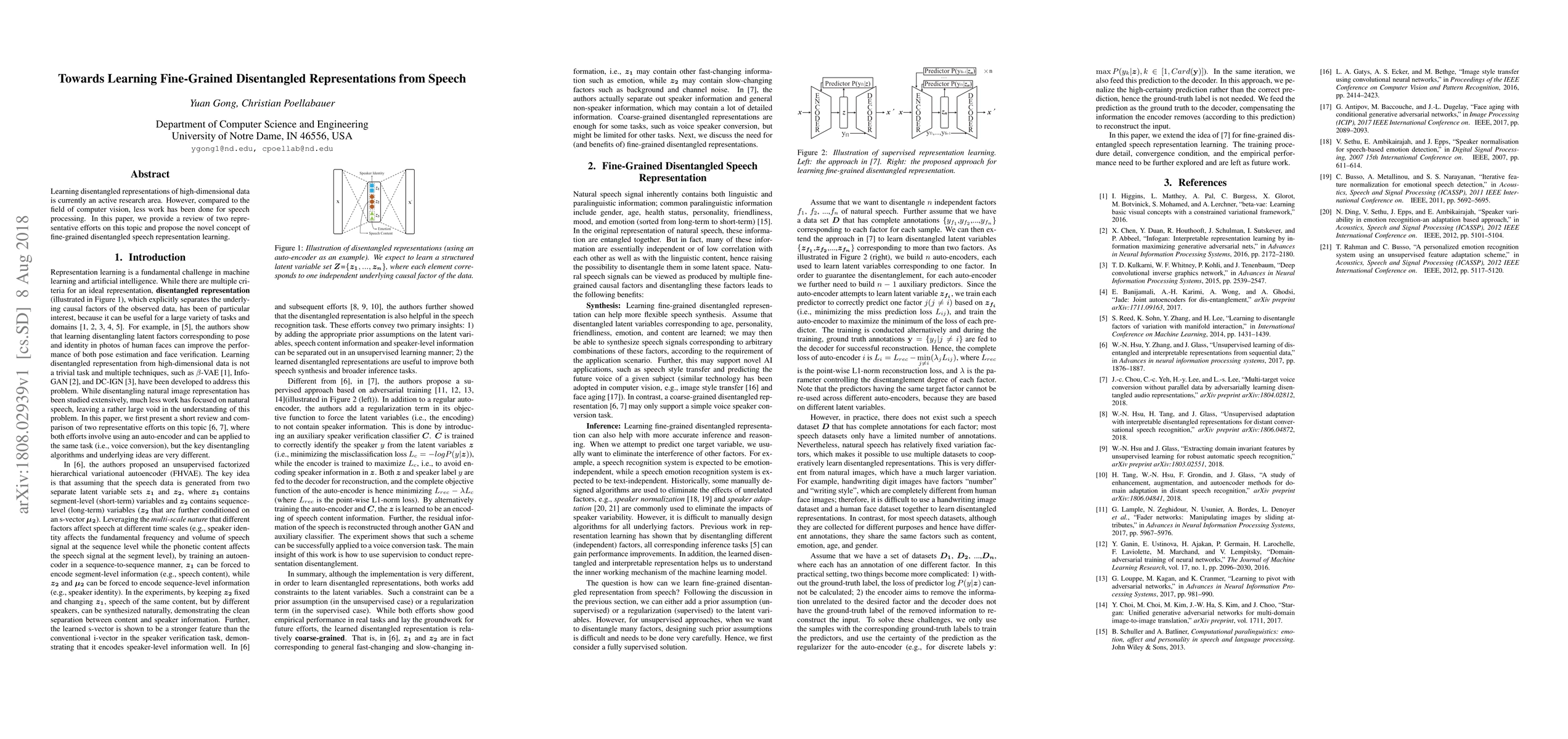 The paper reviews two representative efforts on learning disentangled speech representations and proposes the novel concept of fine-grained disentangled speech representation learning, using both unsupervised and supervised approaches.