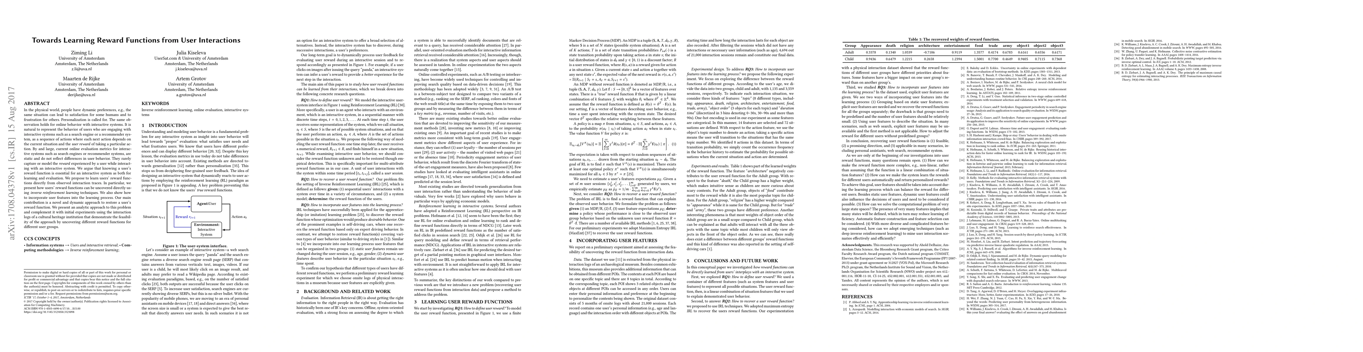 In the physical world, people have dynamic preferences, e.g., the same situation can lead to satisfaction for some humans and to frustration for others. Personalization is called for. The same observation holds for online behavior with interactive systems. It is natural to represent the behavior of users who are engaging with interactive systems such as a search engine or a recommender system, as a sequence of actions where each next action depends on the current situation and the user reward of taking a particular action. By and large, current online evaluation metrics for interactive systems such as search engines or recommender systems, are static and do not reflect differences in user behavior. They rarely capture or model the reward experienced by a user while interacting with an interactive system. We argue that knowing a user's reward function is essential for an interactive system as both for learning and evaluation. We propose to learn users' reward functions directly from observed interaction traces. In particular, we present how users' reward functions can be uncovered directly using inverse reinforcement learning techniques. We also show how to incorporate user features into the learning process. Our main contribution is a novel and dynamic approach to restore a user's reward function. We present an analytic approach to this problem and complement it with initial experiments using the interaction logs of a cultural heritage institution that demonstrate the feasibility of the approach by uncovering different reward functions for different user groups.