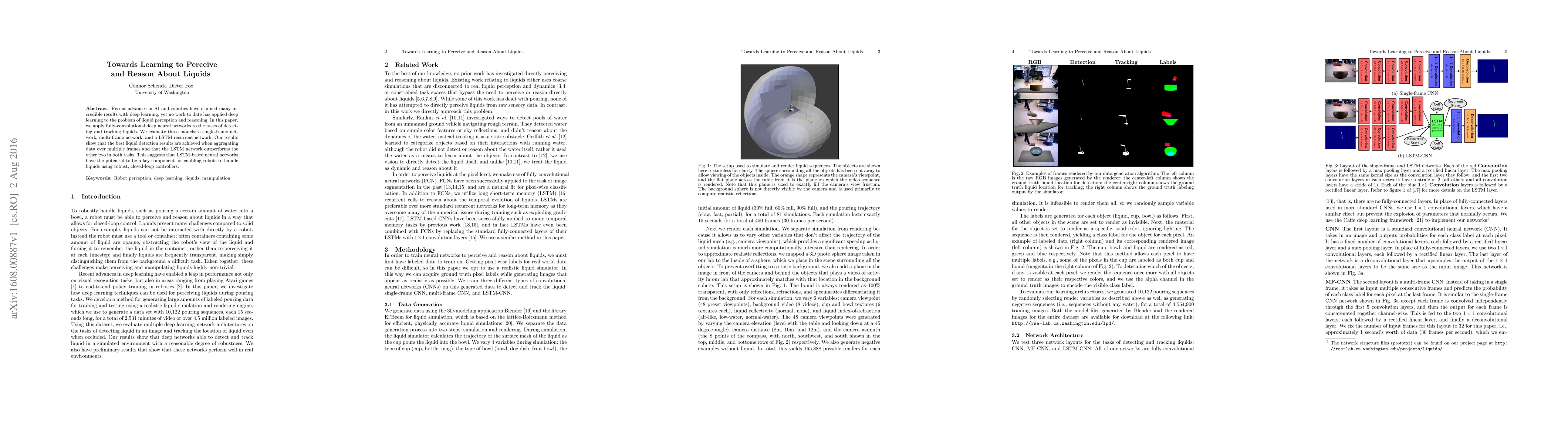This paper explores the application of deep learning to liquid perception and reasoning, evaluating three models for detecting and tracking liquids. The LSTM recurrent network outperforms others, indicating its potential to enable robots to handle liquids effectively.