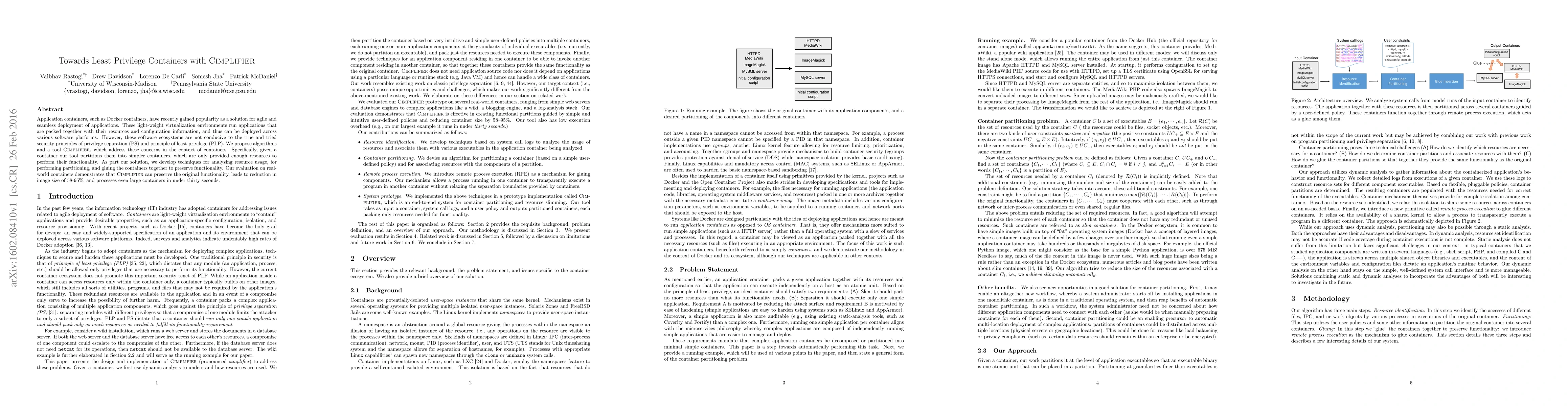 The paper proposes Cimplifier, a tool to partition application containers into simpler, least-privilege versions while preserving functionality. Evaluations show Cimplifier reduces image size by 58-95% and processes large containers efficiently.