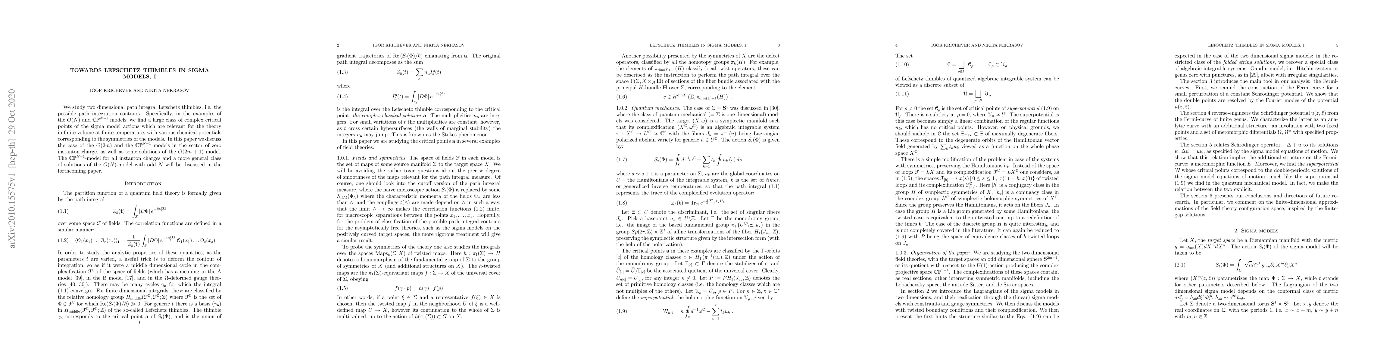 We study two dimensional path integral Lefschetz thimbles, i.e. the possible path integration contours. Specifically, in the examples of the $O(N)$ and ${\bf CP}^{N-1}$ models, we find a large class of complex critical points of the sigma model actions which are relevant for the theory in finite volume at finite temperature, with various chemical potentials corresponding to the symmetries of the models. In this paper we discuss the case of the $O(2m)$ and the ${\bf CP}^{N-1}$ models in the sector of zero instanton charge, as well as some solutions of the $O(2m+1)$ model. The ${\bf CP}^{N-1}$-model for all instanton charges and a more general class of solutions of the $O(N)$-model with odd $N$ will be discussed in the forthcoming paper.