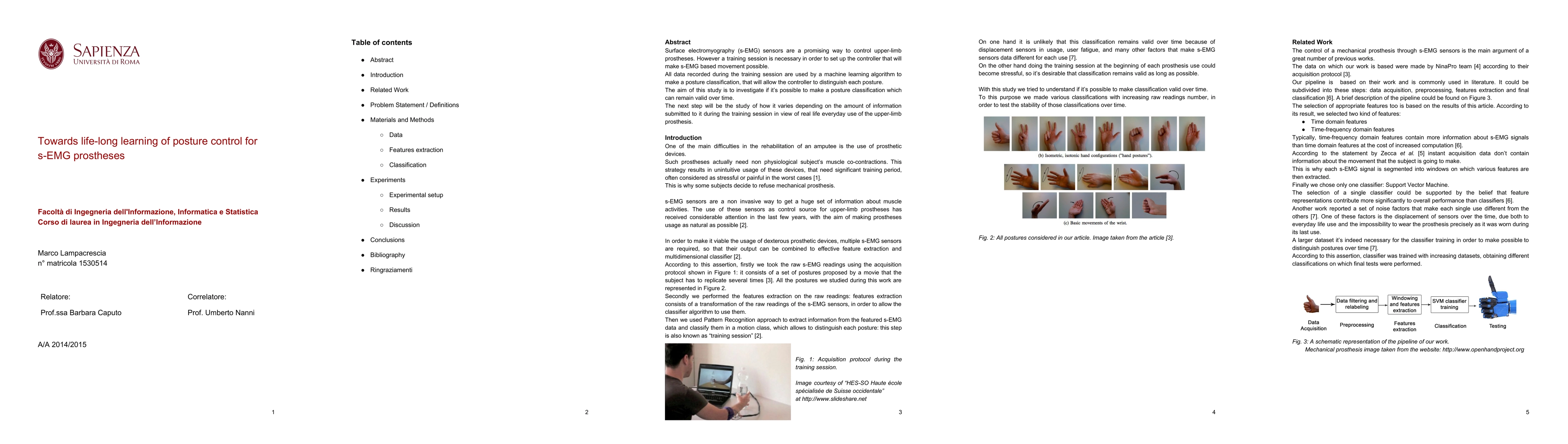 Surface electromyography (s-EMG) sensors are a promising way to control upper-limb prostheses. However a training session is necessary in order to set up the controller that will make s-EMG based movement possible. All data recorded during the training session are used by a machine learning algorithm to make a posture classification, that will allow the controller to distinguish each posture. The aim of this study is to investigate if it's possible to make a posture classification which can remain valid over time. The next step will be the study of how it varies depending on the amount of information submitted to it during the training session in view of real life everyday use of the upper-limb prosthesis.