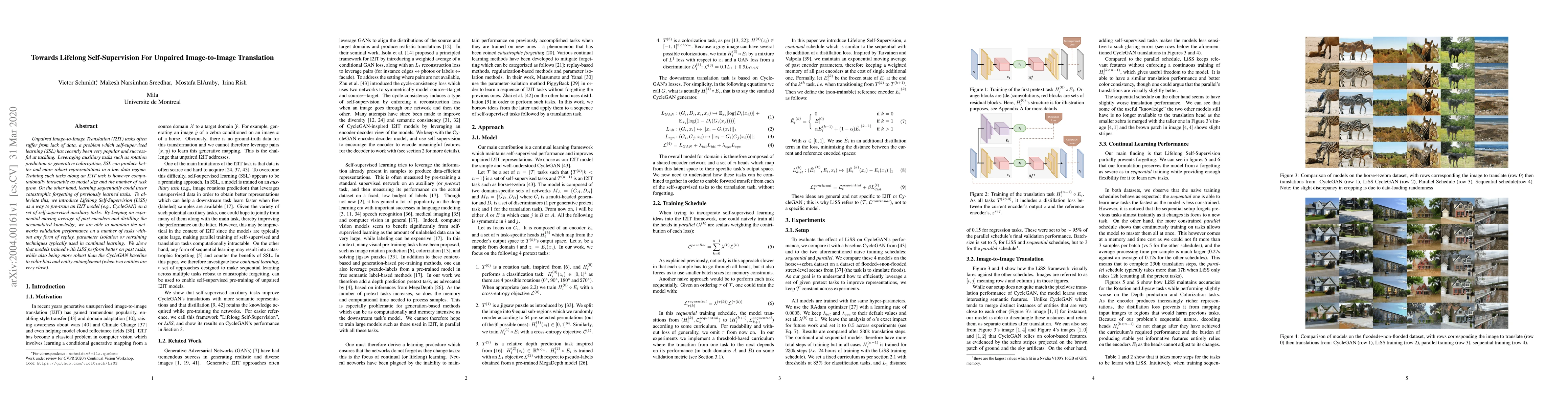 This paper proposes Lifelong Self-Supervision (LiSS) to pre-train unpaired image-to-image translation models using self-supervised tasks, maintaining performance on past tasks without forgetting. LiSS achieves this by distilling knowledge from previous tasks through an exponential moving average of encoders, showing improved robustness and performance compared to the CycleGAN baseline.