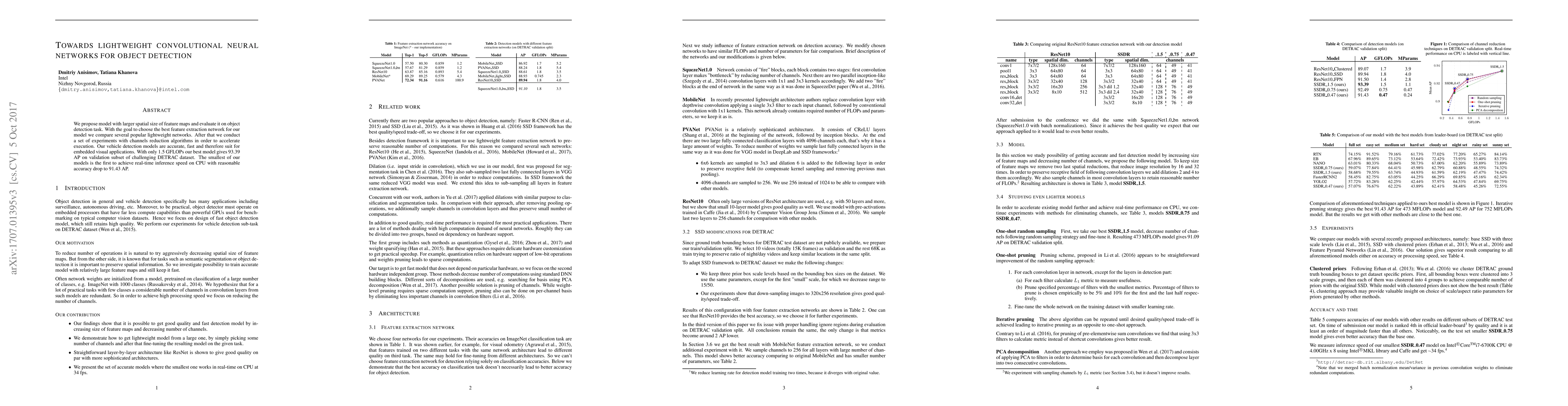 We propose model with larger spatial size of feature maps and evaluate it on object detection task. With the goal to choose the best feature extraction network for our model we compare several popular lightweight networks. After that we conduct a set of experiments with channels reduction algorithms in order to accelerate execution. Our vehicle detection models are accurate, fast and therefore suit for embedded visual applications. With only 1.5 GFLOPs our best model gives 93.39 AP on validation subset of challenging DETRAC dataset. The smallest of our models is the first to achieve real-time inference speed on CPU with reasonable accuracy drop to 91.43 AP.