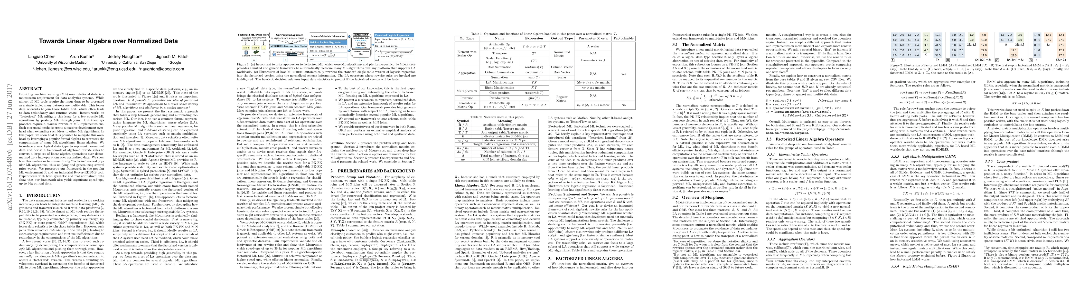 This paper proposes a framework to apply linear algebra over normalized relational data, eliminating the need for data joins and reducing redundancy. It introduces a new data type and algebraic rewrite rules to automatically factorize popular machine learning algorithms, achieving significant speed-ups of up to 36x on real data.