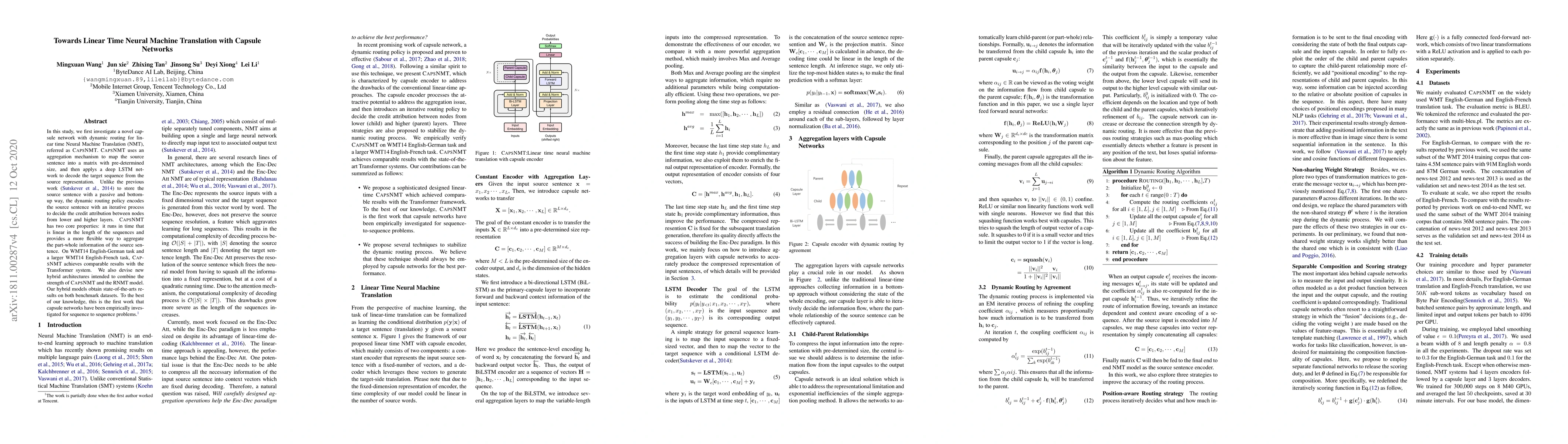 In this study, we first investigate a novel capsule network with dynamic routing for linear time Neural Machine Translation (NMT), referred as \textsc{CapsNMT}. \textsc{CapsNMT} uses an aggregation mechanism to map the source sentence into a matrix with pre-determined size, and then applys a deep LSTM network to decode the target sequence from the source representation. Unlike the previous work \cite{sutskever2014sequence} to store the source sentence with a passive and bottom-up way, the dynamic routing policy encodes the source sentence with an iterative process to decide the credit attribution between nodes from lower and higher layers. \textsc{CapsNMT} has two core properties: it runs in time that is linear in the length of the sequences and provides a more flexible way to select, represent and aggregates the part-whole information of the source sentence. On WMT14 English-German task and a larger WMT14 English-French task, \textsc{CapsNMT} achieves comparable results with the state-of-the-art NMT systems. To the best of our knowledge, this is the first work that capsule networks have been empirically investigated for sequence to sequence problems.