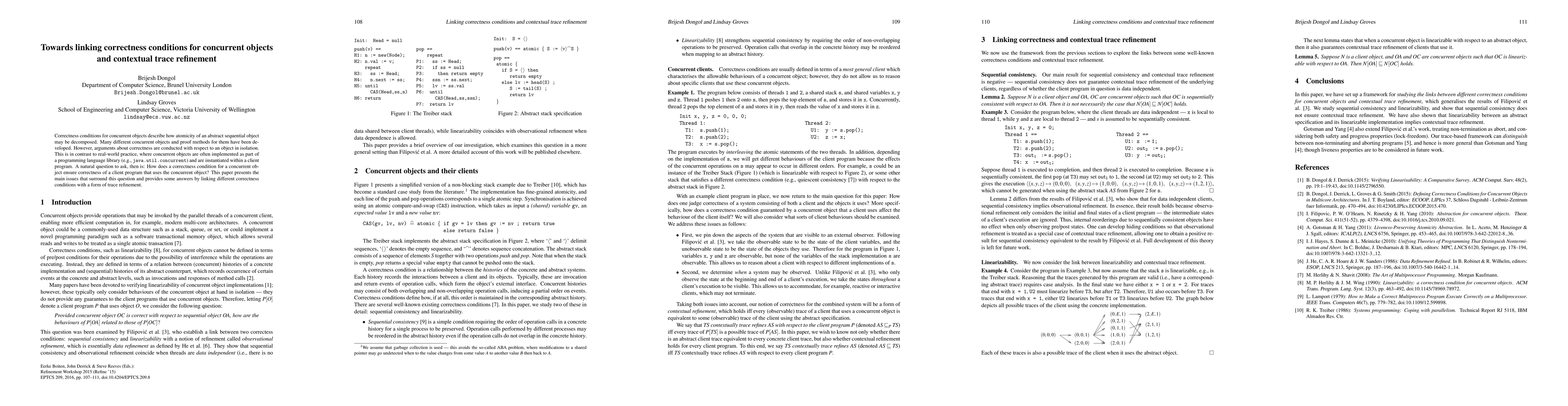 This paper investigates how correctness conditions for isolated concurrent objects can be linked to ensure the correctness of client programs that use these objects. It addresses the gap between theoretical correctness and practical implementation by exploring trace refinement as a method to bridge this connection.