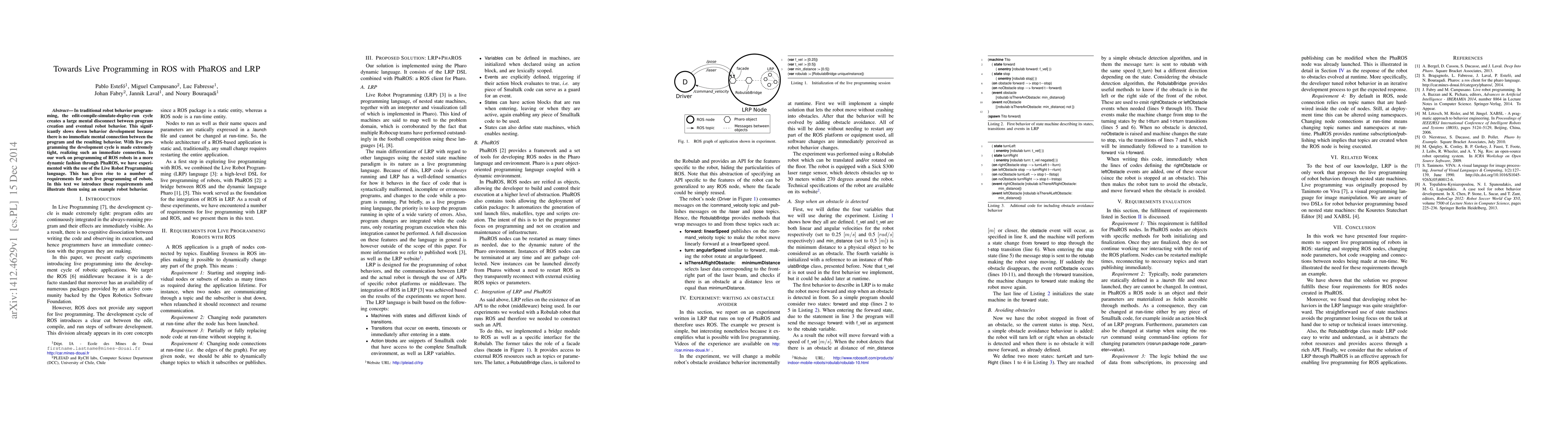 This paper discusses the implementation of live programming for ROS (Robot Operating System) robots using PhaROS and LRP (Live Robot Programming). It highlights the inefficiencies in the traditional edit-compile-simulate-deploy-run cycle and proposes live programming to create an immediate connection between code creation and robot behavior. The authors outline key requirements for live programming of robots, illustrated with a robot behavior example.