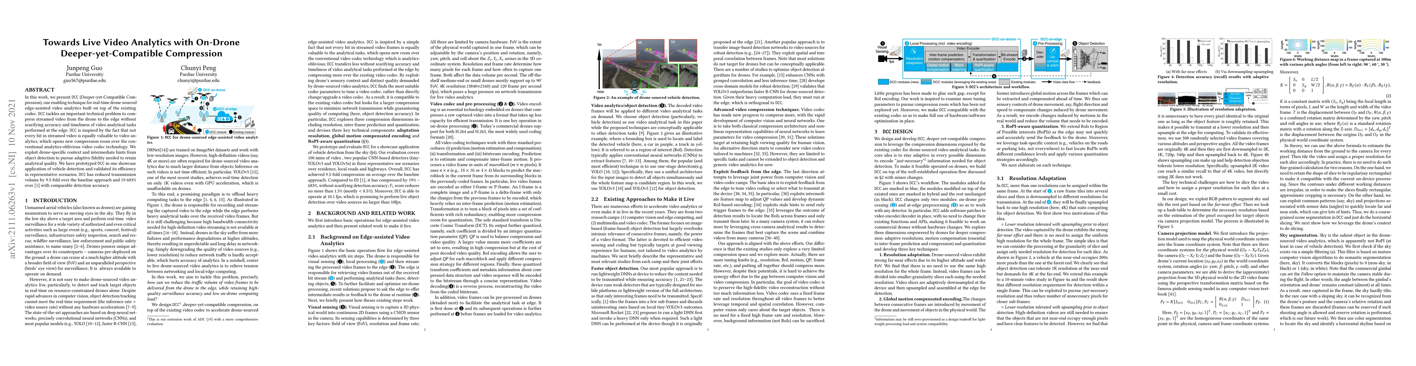In this work, we present DCC(Deeper-yet-Compatible Compression), one enabling technique for real-time drone-sourced edge-assisted video analytics built on top of the existing codec. DCC tackles an important technical problem to compress streamed video from the drone to the edge without scarifying accuracy and timeliness of video analytical tasks performed at the edge. DCC is inspired by the fact that not every bit in streamed video is equally valuable to video analytics, which opens new compression room over the conventional analytics-oblivious video codec technology. We exploit drone-specific context and intermediate hints from object detection to pursue adaptive fidelity needed to retain analytical quality. We have prototyped DCC in one showcase application of vehicle detection and validated its efficiency in representative scenarios. DCC has reduced transmission volume by 9.5-fold over the baseline approach and 19-683% over the state-of-the-art with comparable detection accuracy.