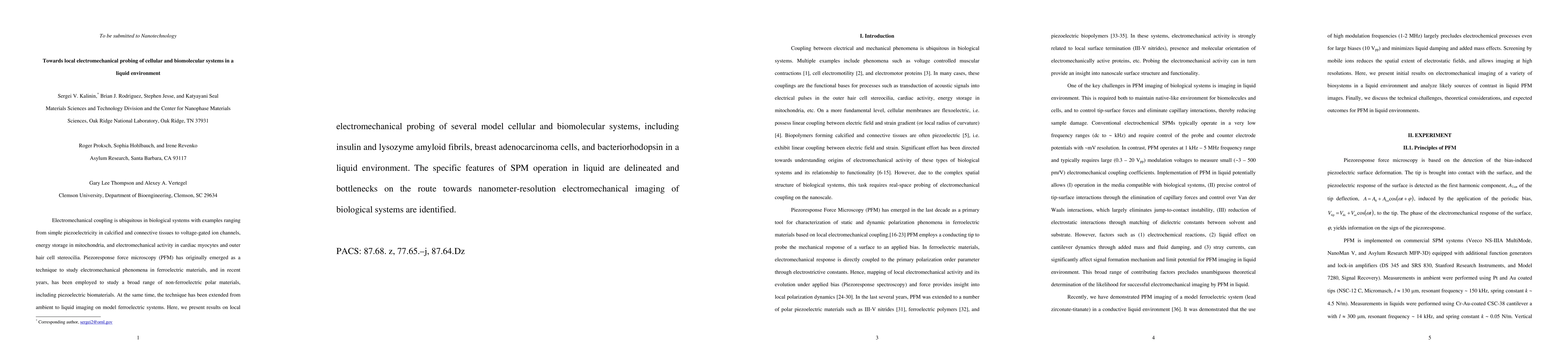 This paper explores the application of piezoresponse force microscopy (PFM) for local electromechanical probing of cellular and biomolecular systems in liquid environments, demonstrating its use on insulin and lysozyme amyloid fibrils, breast adenocarcinoma cells, and bacteriorhodopsin, and identifies challenges for achieving high-resolution imaging.