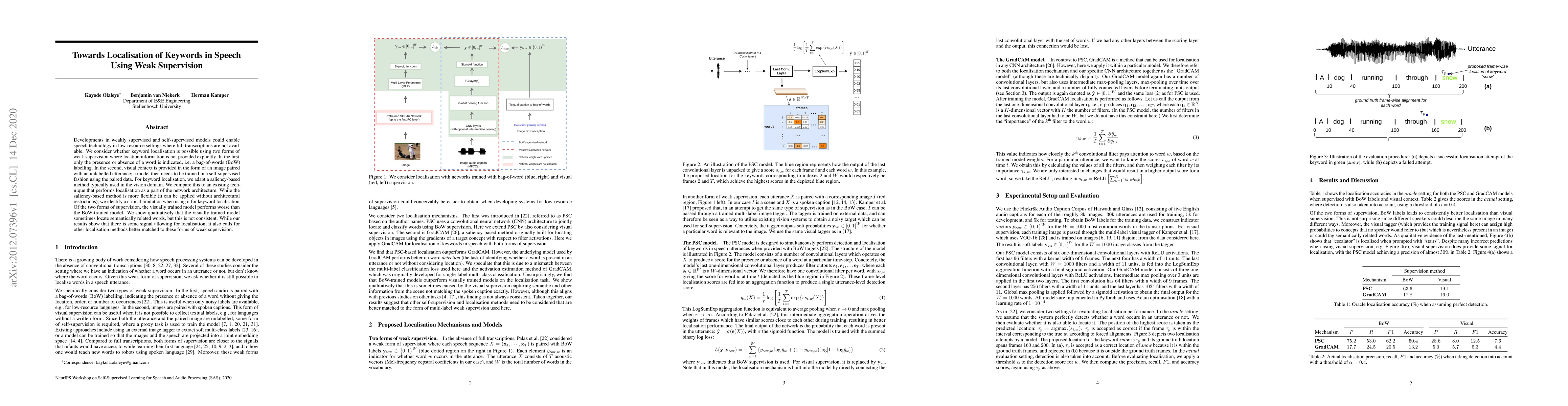 This paper explores keyword localisation in speech using weak supervision, comparing bag-of-words labelling and visual context pairing. While the saliency-based method shows flexibility, it struggles with localisation, and the visually trained model performs worse than the bag-of-words model, indicating a need for better-suited localisation techniques for weak supervision.