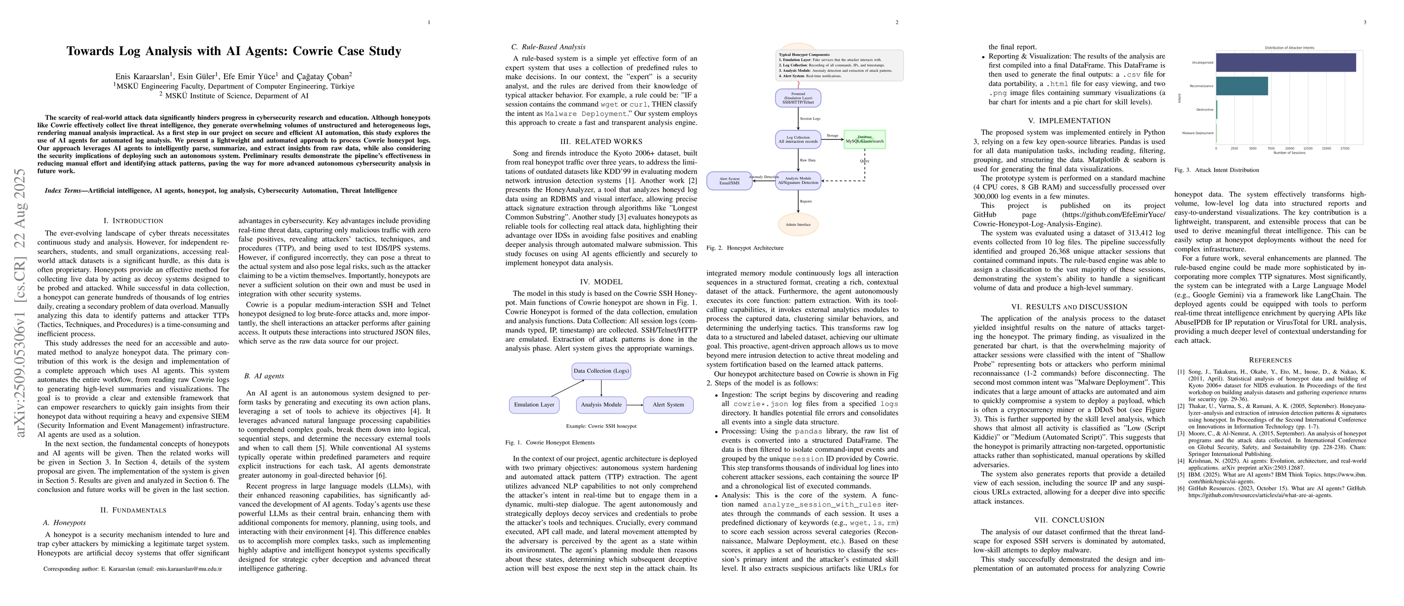 The scarcity of real-world attack data significantly hinders progress in cybersecurity research and education. Although honeypots like Cowrie effectively collect live threat intelligence, they generate overwhelming volumes of unstructured and heterogeneous logs, rendering manual analysis impractical. As a first step in our project on secure and efficient AI automation, this study explores the use of AI agents for automated log analysis. We present a lightweight and automated approach to process Cowrie honeypot logs. Our approach leverages AI agents to intelligently parse, summarize, and extract insights from raw data, while also considering the security implications of deploying such an autonomous system. Preliminary results demonstrate the pipeline's effectiveness in reducing manual effort and identifying attack patterns, paving the way for more advanced autonomous cybersecurity analysis in future work.