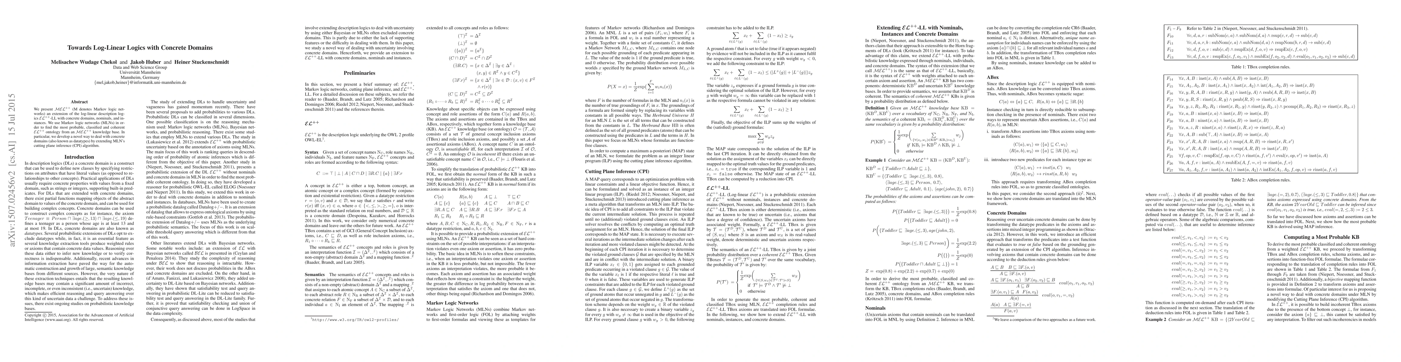 This paper introduces $\mathcal{MEL}^{++}$, an extension of log-linear description logics $\mathcal{EL}^{++}$-LL, incorporating concrete domains, nominals, and instances. It employs Markov logic networks to derive the most probable and coherent $\mathcal{EL}^{++}$ ontology from an $\mathcal{MEL}^{++}$ knowledge base, innovating the cutting plane inference algorithm for concrete domains.