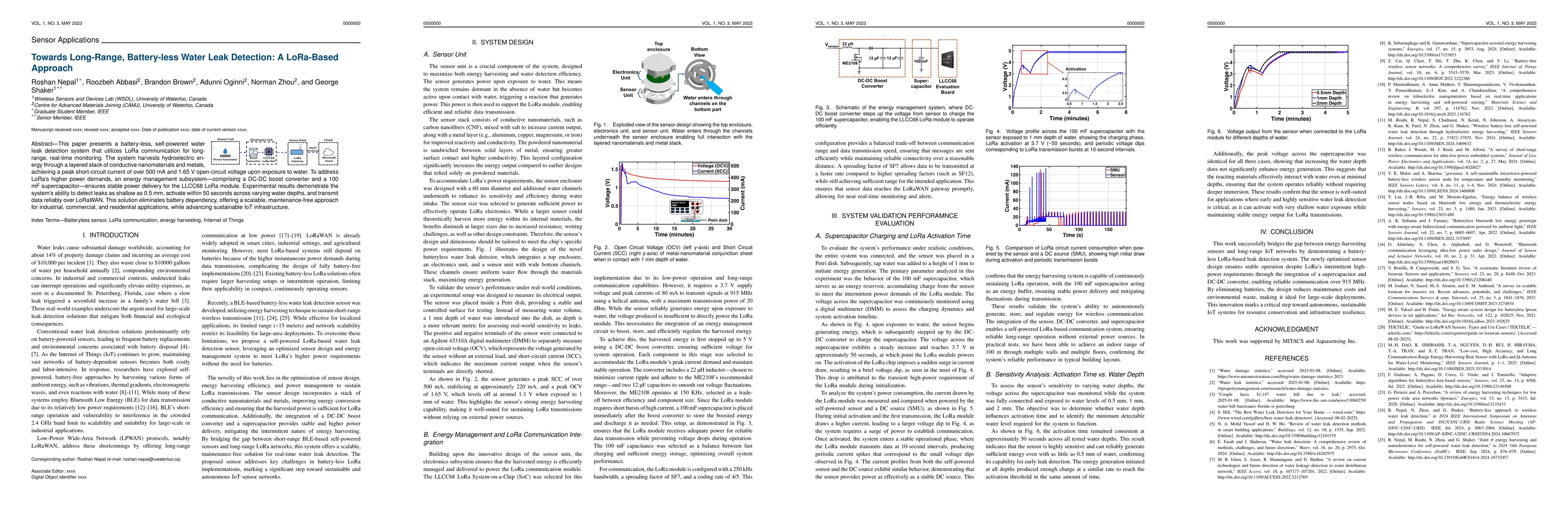 This paper presents a battery-less, self-powered water leak detection system that utilizes LoRa communication for long-range, real-time monitoring. The system harvests hydroelectric energy through a layered stack of conductive nanomaterials and metals, achieving a peak short-circuit current of over 500 mA and 1.65 V open-circuit voltage upon exposure to water. To address LoRa's higher power demands, an energy management subsystem -- comprising a DC-DC boost converter and a 100 mF supercapacitor -- ensures stable power delivery for the LLCC68 LoRa module. Experimental results demonstrate the system's ability to detect leaks as shallow as 0.5 mm, activate within 50 seconds across varying water depths, and transmit data reliably over LoRaWAN. This solution eliminates battery dependency, offering a scalable, maintenance-free approach for industrial, commercial, and residential applications, while advancing sustainable IoT infrastructure.