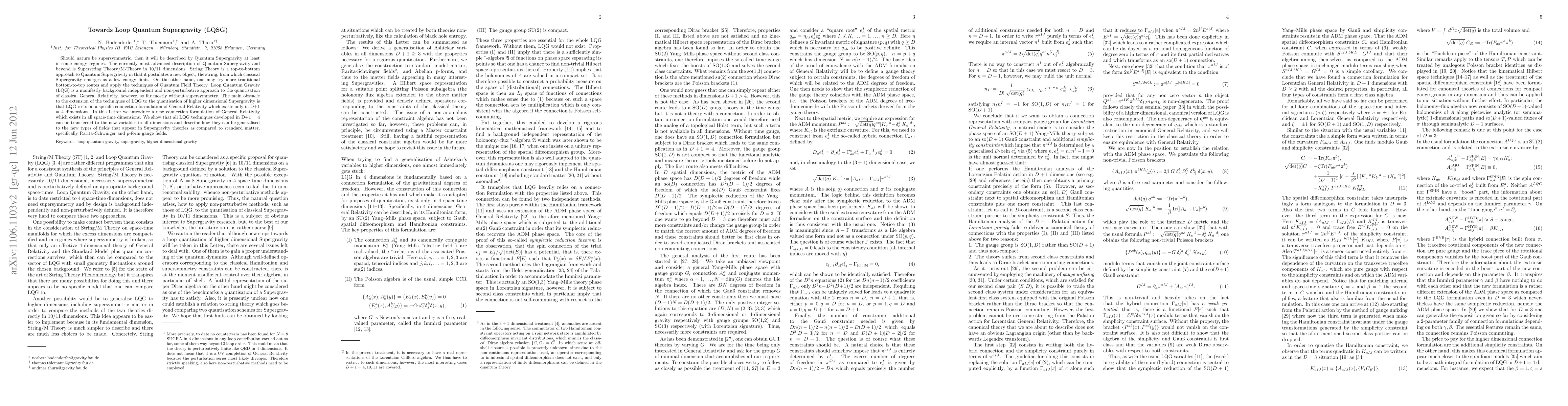 Should nature be supersymmetric, then it will be described by Quantum Supergravity at least in some energy regimes. The currently most advanced description of Quantum Supergravity and beyond is Superstring Theory/M-Theory in 10/11 dimensions. String Theory is a top-to-bottom approach to Quantum Supergravity in that it postulates a new object, the string, from which classical Supergravity emerges as a low energy limit. On the other hand, one may try more traditional bottom-to-top routes and apply the techniques of Quantum Field Theory. Loop Quantum Gravity (LQG) is a manifestly background independent and non-perturbative approach to the quantisation of classical General Relativity, however, so far mostly without supersymmetry. The main obstacle to the extension of the techniques of LQG to the quantisation of higher dimensional Supergravity is that LQG rests on a specific connection formulation of General Relativity which exists only in D+1 = 4 dimensions. In this Letter we introduce a new connection formulation of General Relativity which exists in all space-time dimensions. We show that all LQG techniques developed in D+1 = 4 can be transferred to the new variables in all dimensions and describe how they can be generalised to the new types of fields that appear in Supergravity theories as compared to standard matter, specifically Rarita-Schwinger and p-form gauge fields.