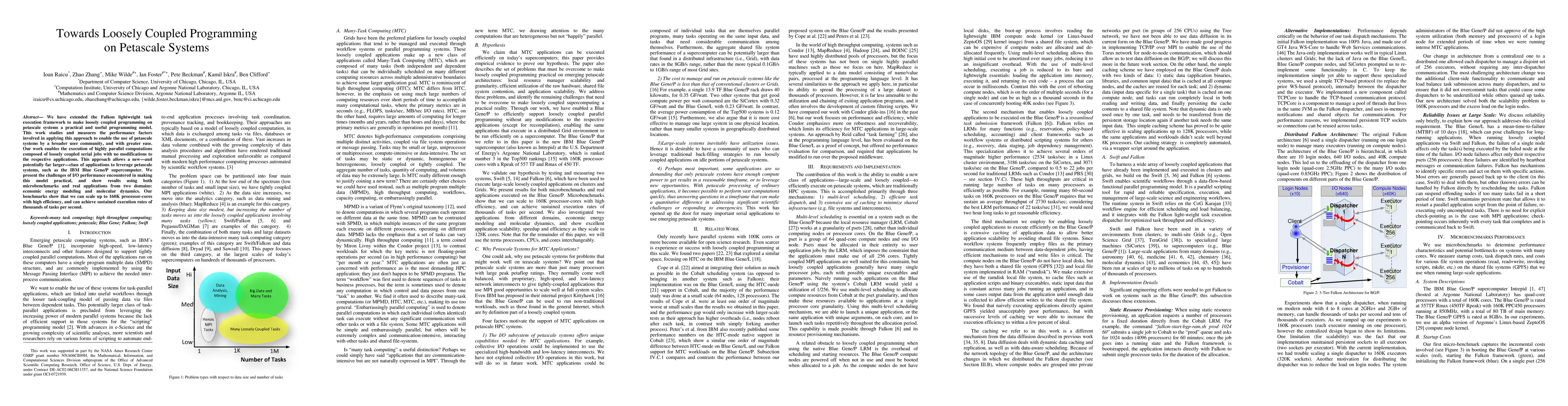 This paper extends the Falkon framework to facilitate loosely coupled programming on petascale systems, enabling broader application use without modification. It addresses I/O performance challenges and demonstrates scalability up to 160K cores with efficient execution rates, validated through microbenchmarks and real-world applications in economic modeling and molecular dynamics.