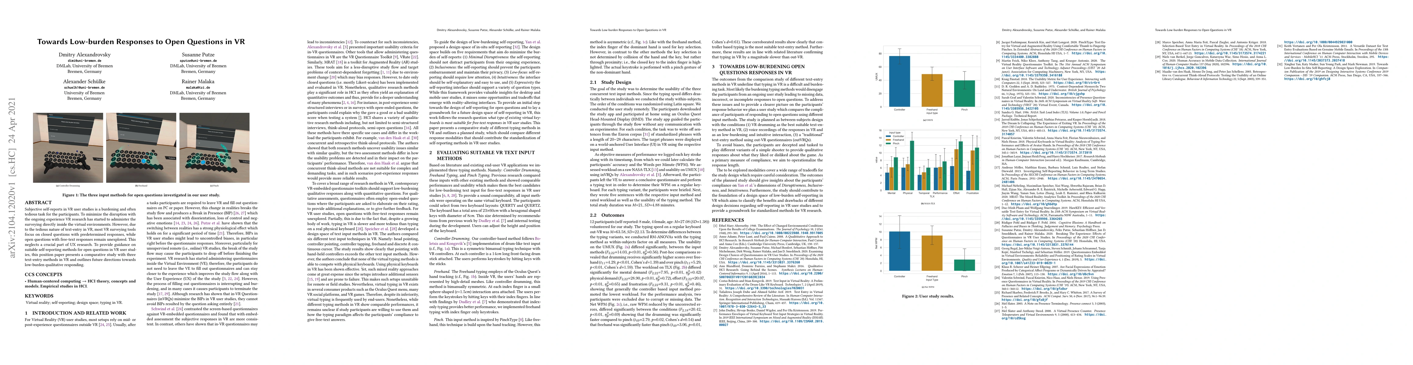 This paper explores minimizing participant burden in VR user studies by comparing three text-entry methods for open-ended questions within virtual environments, aiming to enhance qualitative user experience research. Future directions for low-burden qualitative responses in VR are proposed.