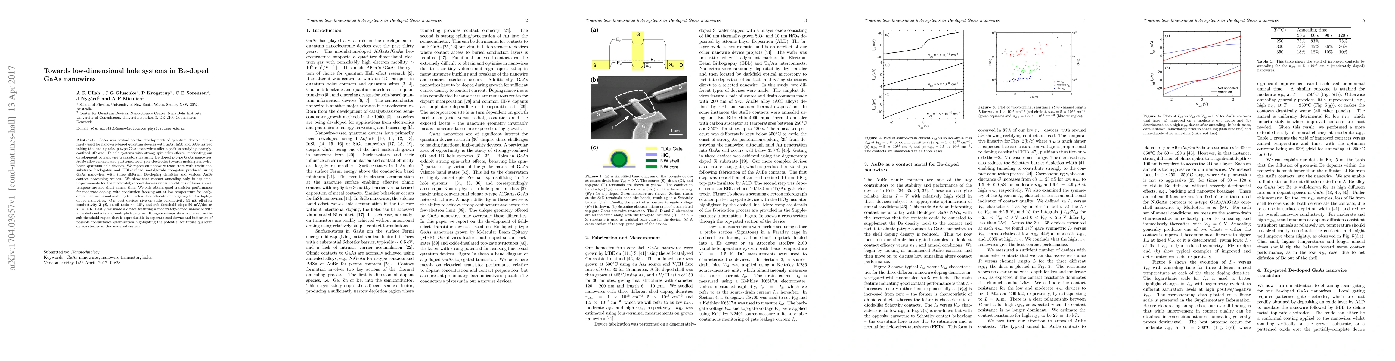 This paper investigates Be-doped p-type GaAs nanowires for low-dimensional hole systems, developing nanowire transistors with varying Be-doping densities and AuBe contacts. The study highlights that moderate doping yields optimal transistor performance, while low and high doping levels result in conduction freezing and poor off-state, respectively. The best devices show a promising on-off ratio and potential for conductance quantization, indicating future quantum device potential.