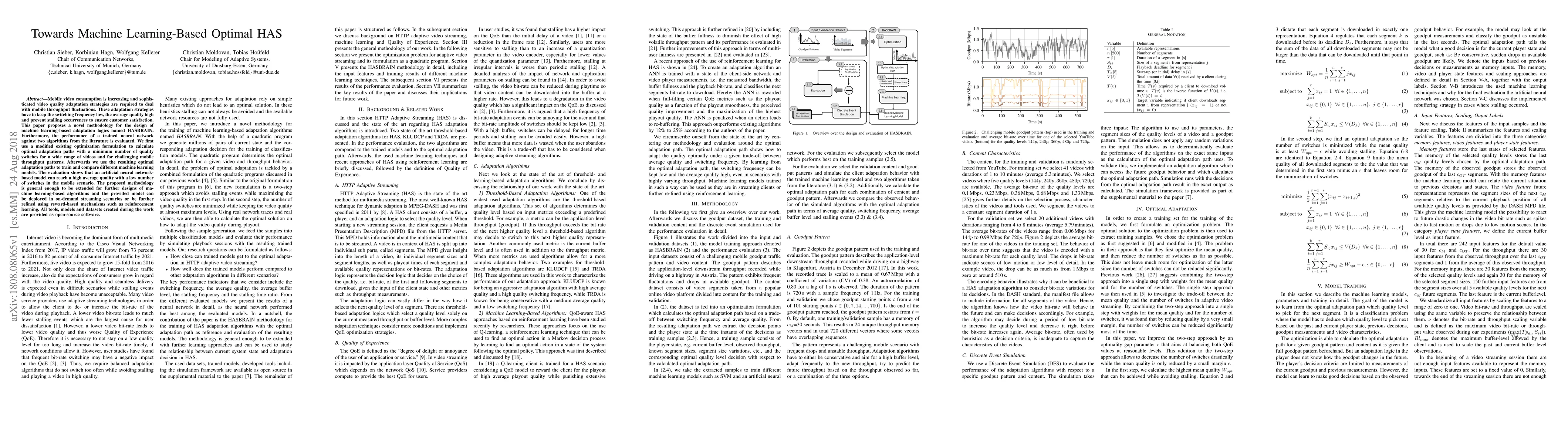Mobile video consumption is increasing and sophisticated video quality adaptation strategies are required to deal with mobile throughput fluctuations. These adaptation strategies have to keep the switching frequency low, the average quality high and prevent stalling occurrences to ensure customer satisfaction. This paper proposes a novel methodology for the design of machine learning-based adaptation logics named HASBRAIN. Furthermore, the performance of a trained neural network against two algorithms from the literature is evaluated. We first use a modified existing optimization formulation to calculate optimal adaptation paths with a minimum number of quality switches for a wide range of videos and for challenging mobile throughput patterns. Afterwards we use the resulting optimal adaptation paths to train and compare different machine learning models. The evaluation shows that an artificial neural network-based model can reach a high average quality with a low number of switches in the mobile scenario. The proposed methodology is general enough to be extended for further designs of machine learning-based algorithms and the provided model can be deployed in on-demand streaming scenarios or be further refined using reward-based mechanisms such as reinforcement learning. All tools, models and datasets created during the work are provided as open-source software.