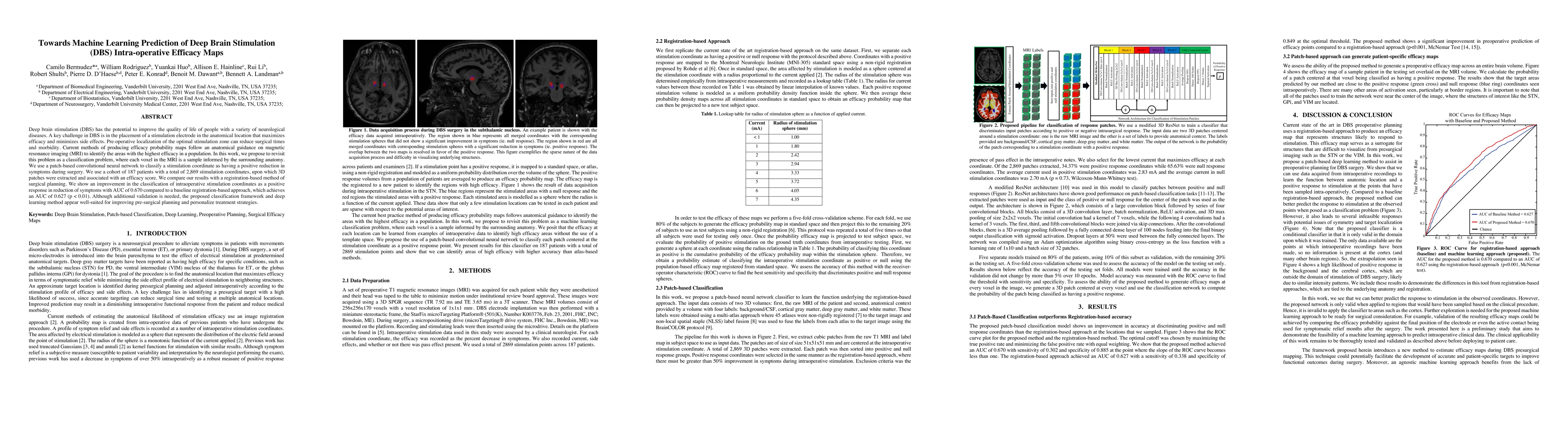 This paper proposes a patch-based convolutional neural network to classify intraoperative DBS stimulation coordinates for predicting efficacy, improving upon traditional registration-based methods. The model achieved an AUC of 0.670 compared to 0.627 for the baseline, indicating potential for enhanced pre-surgical planning and personalized treatment.