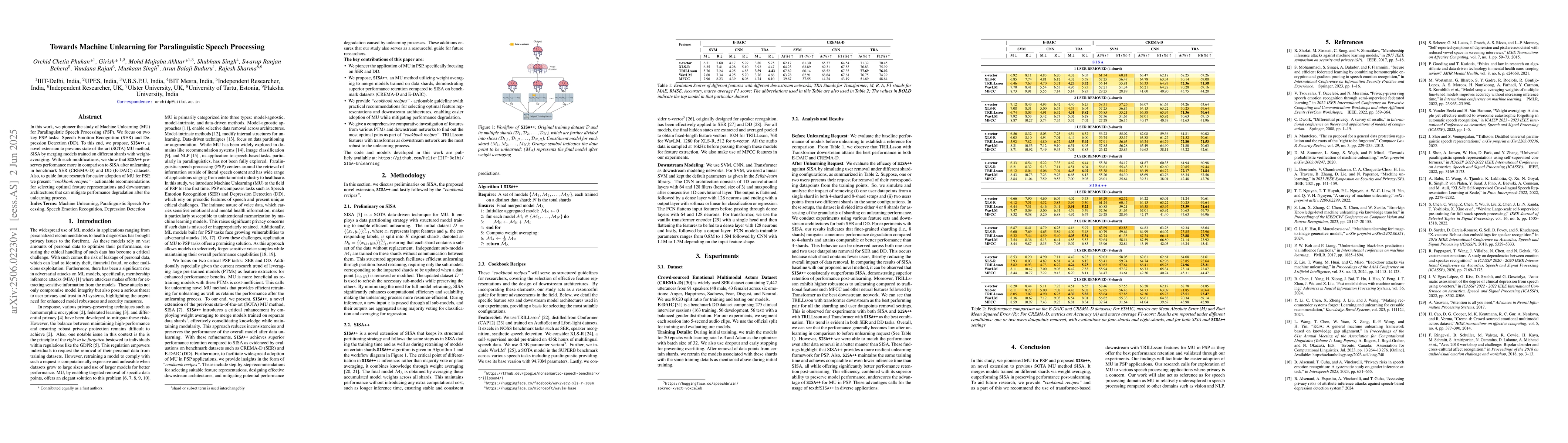 In this work, we pioneer the study of Machine Unlearning (MU) for Paralinguistic Speech Processing (PSP). We focus on two key PSP tasks: Speech Emotion Recognition (SER) and Depression Detection (DD). To this end, we propose, SISA++, a novel extension to previous state-of-the-art (SOTA) MU method, SISA by merging models trained on different shards with weight-averaging. With such modifications, we show that SISA++ preserves performance more in comparison to SISA after unlearning in benchmark SER (CREMA-D) and DD (E-DAIC) datasets. Also, to guide future research for easier adoption of MU for PSP, we present ``cookbook recipes'' - actionable recommendations for selecting optimal feature representations and downstream architectures that can mitigate performance degradation after the unlearning process.