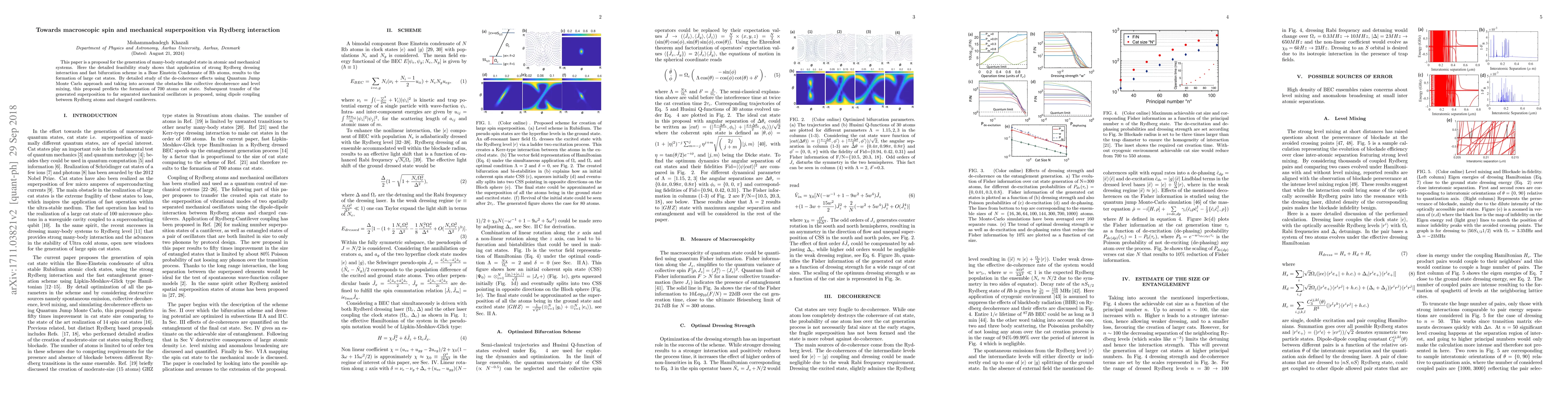 This paper is a proposal for the generation of many-body entangled state in atomic and mechanical systems. Application of strong Rydberg dressing interaction and fast bifurcation scheme in an ultra-stable Cs lattice clock in this proposal results to a breakthrough in the formation of large cat states. By detailed study of the de-coherence effects using Quantum Jump Monte Carlo approach and considering obstacles in dense ensembles namely level mixing, molecule formation and collective decoherence this proposal predicts the formation of 700 atoms cat state. Dipole coupling between Rydberg atoms and charged cantilevers is proposed for the transfer of the generated superposition to far separated mechanical oscillators.