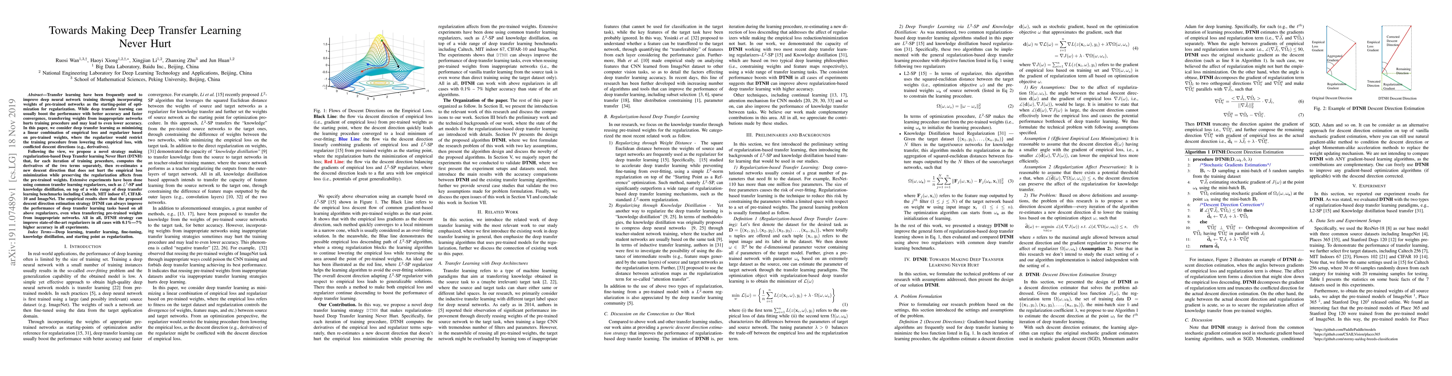 A new method called Deep Transfer Learning Never Hurt (DTNH) improves deep transfer learning performance by avoiding negative effects of transferring weights from inappropriate networks, achieving 0.1%--7% higher accuracy in various experiments.
