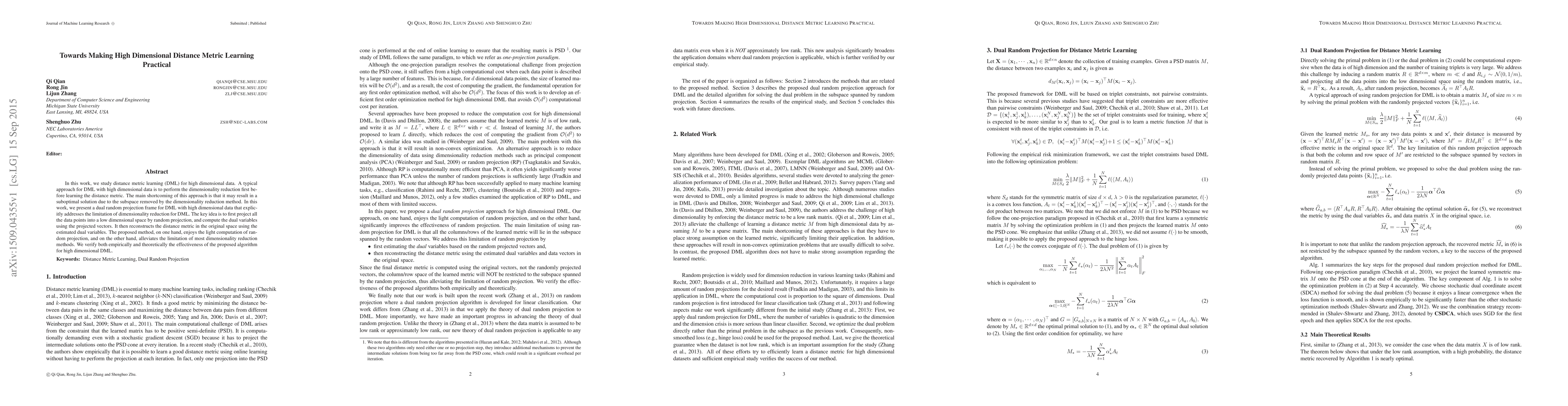 This paper proposes a dual random projection framework for distance metric learning in high-dimensional data, aiming to overcome the limitations of traditional dimensionality reduction methods. The method projects data into a lower-dimensional space using random projection, computes dual variables, and reconstructs the distance metric in the original space, achieving both computational efficiency and improved performance.