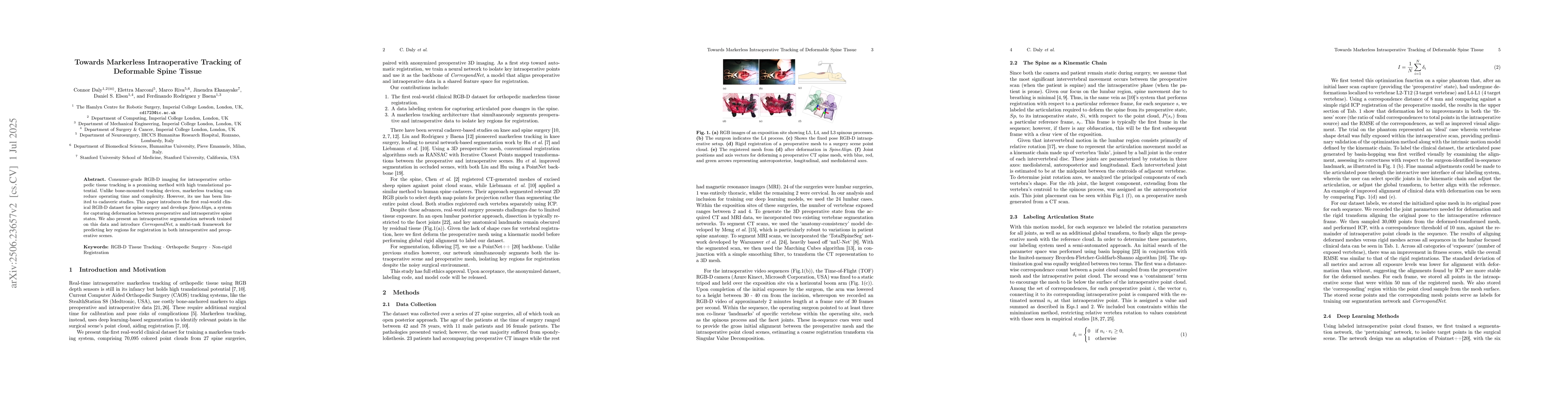 This research introduces a real-world clinical RGB-D dataset for spine surgery, developing SpineAlign for tracking deformable spine tissue deformation. It also presents an intraoperative segmentation network and CorrespondNet, a multi-task framework for registration in both intraoperative and preoperative scenes, aiming to simplify spine surgeries using markerless RGB-D imaging.