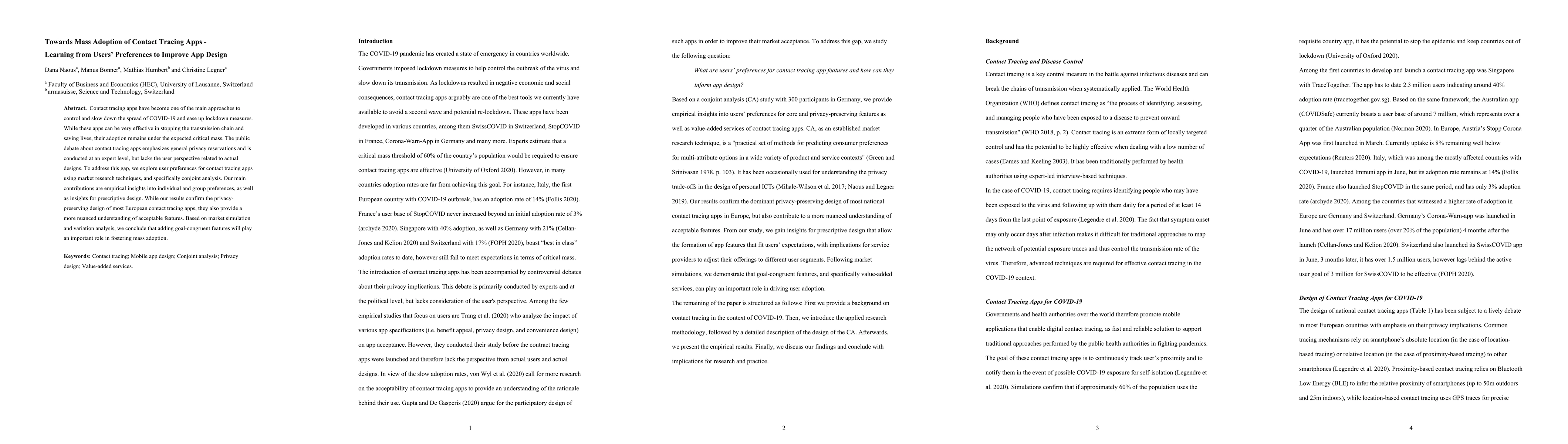This paper investigates user preferences for contact tracing apps through market research, revealing insights into individual and group preferences to improve app design. The study suggests that incorporating goal-congruent features, while maintaining privacy, is crucial for achieving mass adoption of these apps.