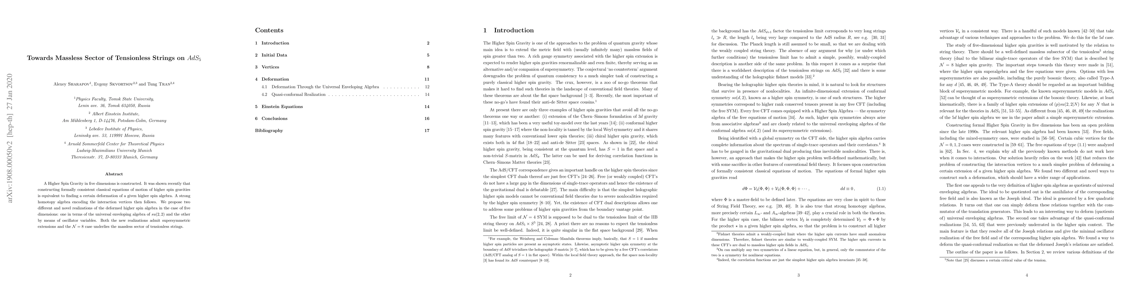 {A} Higher Spin Gravity in five dimensions is constructed. It was shown recently that constructing formally consistent classical equations of motion of higher spin gravities is equivalent to finding a certain deformation of a given higher spin algebra. A strong homotopy algebra encoding the interaction vertices then follows. We propose two different and novel realizations of the deformed higher spin algebra in the case of five dimensions: one in terms of the universal enveloping algebra of $su(2,2)$ and the other by means of oscillator variables. Both the new realizations admit supersymmetric extensions and the $\mathcal{N}=8$ case underlies the massless sector of tensionless strings.