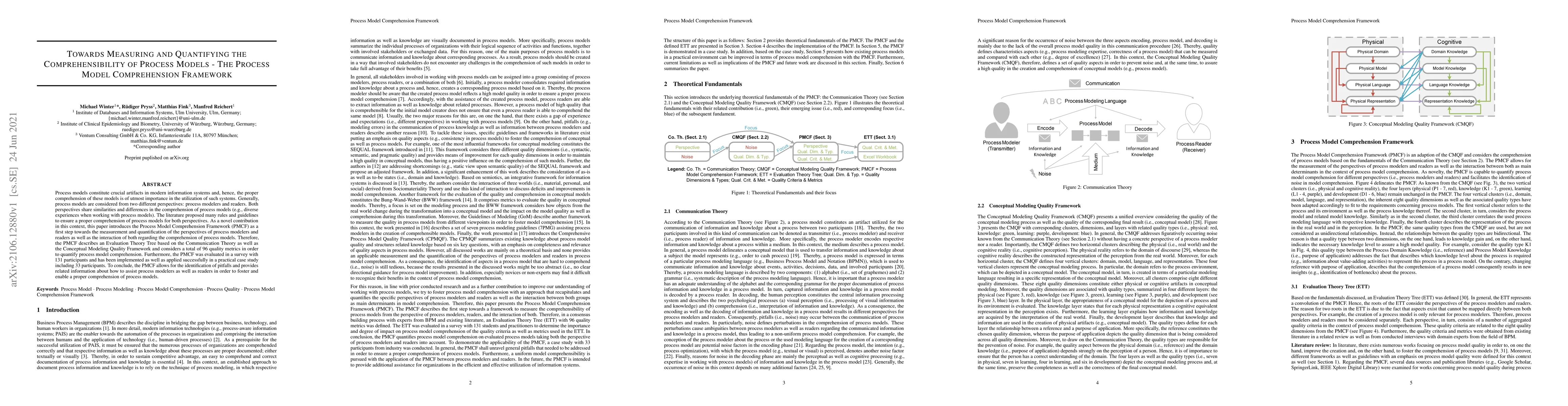 Process models constitute crucial artifacts in modern information systems and, hence, the proper comprehension of these models is of utmost importance in the utilization of such systems. Generally, process models are considered from two different perspectives: process modelers and readers. Both perspectives share similarities and differences in the comprehension of process models (e.g., diverse experiences when working with process models). The literature proposed many rules and guidelines to ensure a proper comprehension of process models for both perspectives. As a novel contribution in this context, this paper introduces the Process Model Comprehension Framework (PMCF) as a first step towards the measurement and quantification of the perspectives of process modelers and readers as well as the interaction of both regarding the comprehension of process models. Therefore, the PMCF describes an Evaluation Theory Tree based on the Communication Theory as well as the Conceptual Modeling Quality Framework and considers a total of 96 quality metrics in order to quantify process model comprehension. Furthermore, the PMCF was evaluated in a survey with 131 participants and has been implemented as well as applied successfully in a practical case study including 33 participants. To conclude, the PMCF allows for the identification of pitfalls and provides related information about how to assist process modelers as well as readers in order to foster and enable a proper comprehension of process models.