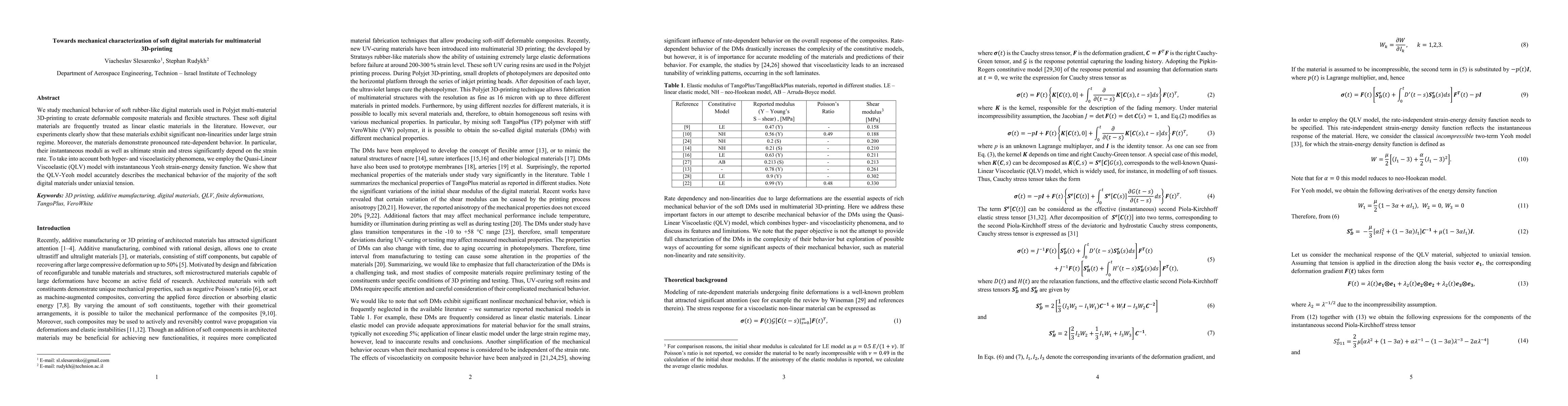 This paper investigates the mechanical behavior of soft rubber-like materials used in Polyjet multi-material 3D-printing, revealing significant non-linearities and rate-dependent properties. The Quasi-Linear Viscoelastic (QLV) model with Yeoh strain-energy density function is employed to accurately describe these materials' hyper- and viscoelastic behavior under uniaxial tension.