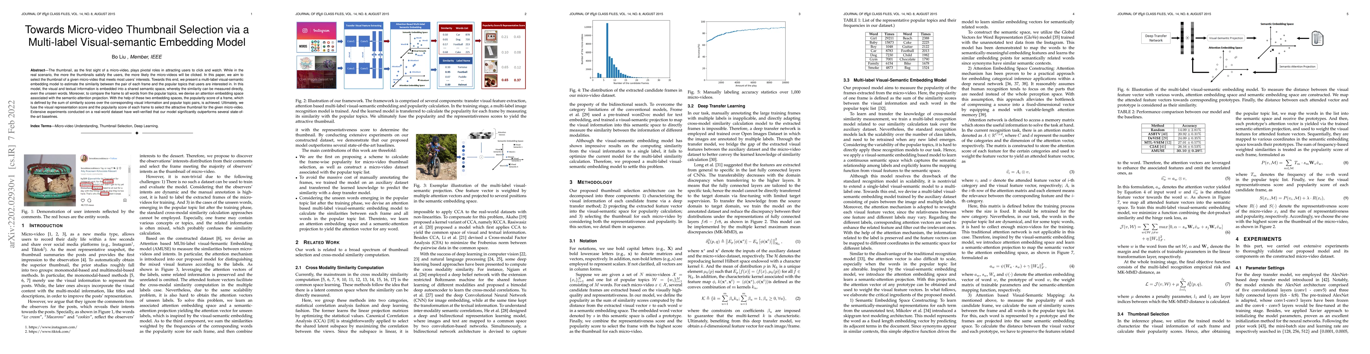 This paper proposes a multi-label visual-semantic embedding model to select optimal thumbnails for micro-videos by estimating frame similarity to popular user topics. The model combines visual and textual information in a shared semantic space, achieving better performance than state-of-the-art baselines.