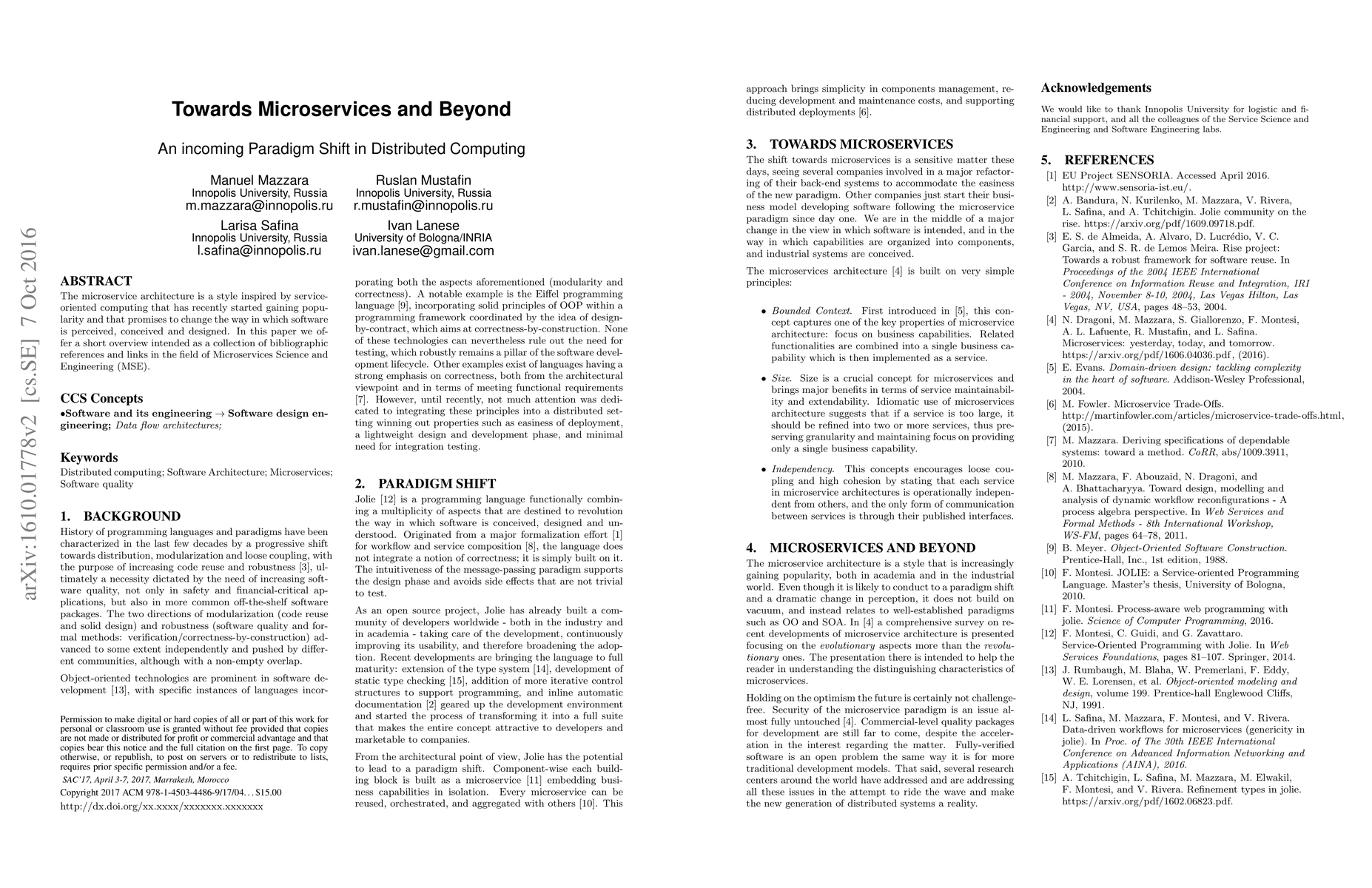 The microservice architecture is a style inspired by service-oriented computing that has recently started gaining popularity and that promises to change the way in which software is perceived, conceived and designed. In this paper we offer a short overview intended as a collection of bibliographic references and links in the field of Microservices Science and Engineering (MSE).