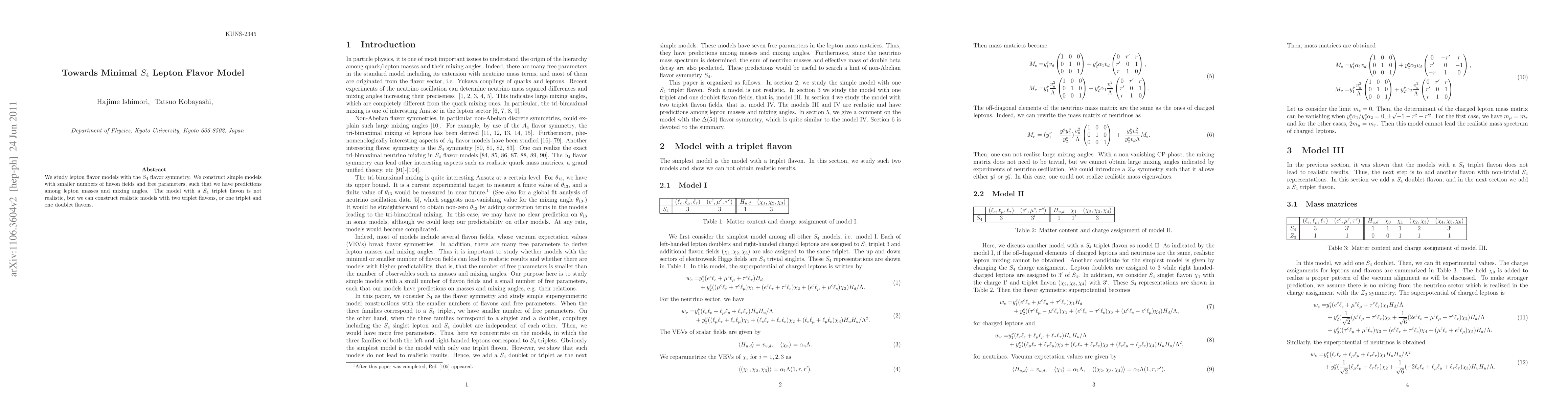 This paper explores minimal S4 lepton flavor models, focusing on those with fewer flavon fields and parameters to predict lepton masses and mixing angles. While a single S4 triplet flavon model is unfeasible, the study finds realistic models using two triplet flavons or a combination of one triplet and one doublet flavon.