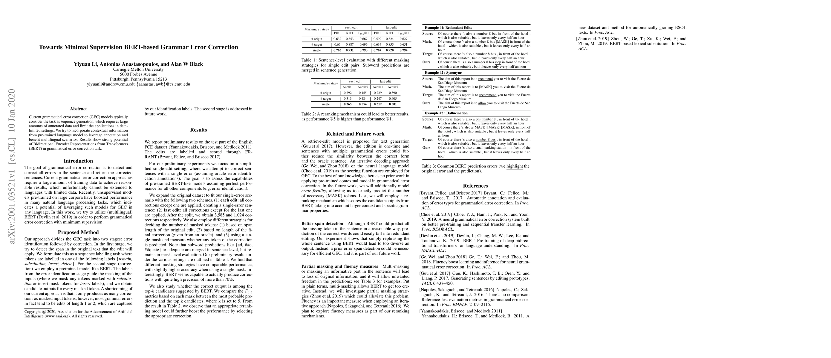 This paper explores minimal supervision approaches for grammatical error correction using BERT, aiming to reduce reliance on large annotated datasets. It demonstrates BERT's effectiveness in leveraging contextual information for error correction, showing promise for multilingual applications.