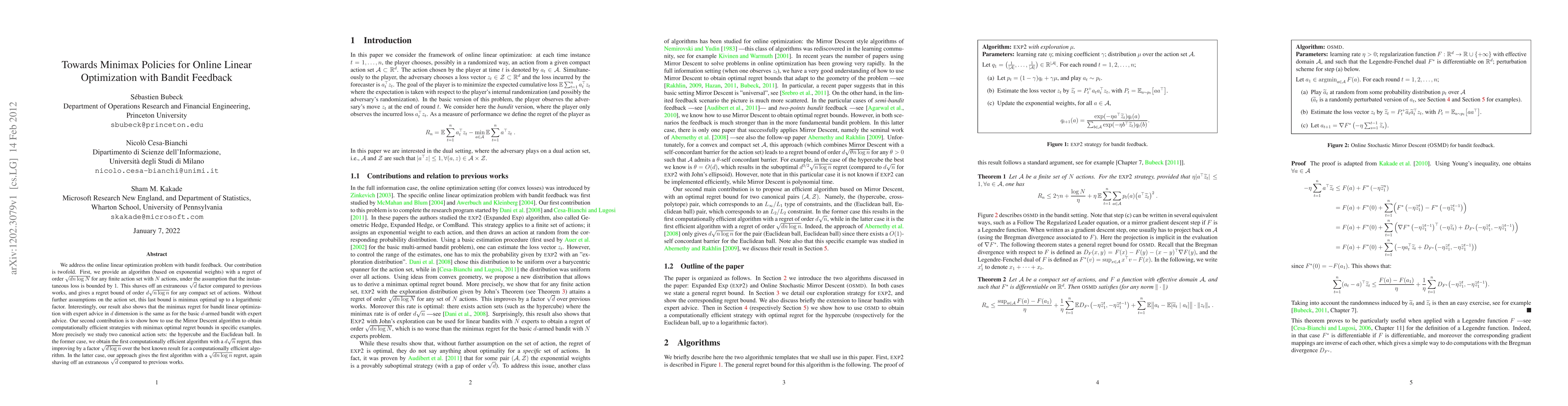 This paper develops a new algorithm for online linear optimization with bandit feedback that achieves minimax regret bounds of $d imes ext{log}(n)$ for specific action sets, improving upon previous results.