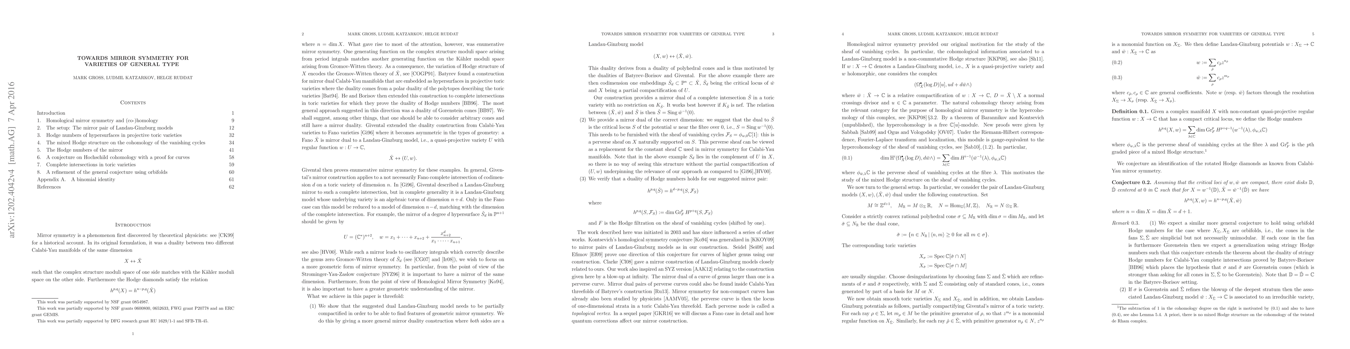 The goal of this paper is to propose a theory of mirror symmetry for varieties of general type. Using Landau-Ginzburg mirrors as motivation, we describe the mirror of a hypersurface of general type (and more generally varieties of non-negative Kodaira dimension) as the critical locus of the zero fibre of a certain Landau-Ginzburg potential. The critical locus carries a perverse sheaf of vanishing cycles. Our main results shows that one obtains the interchange of Hodge numbers expected in mirror symmetry. This exchange is between the Hodge numbers of the hypersurface and certain Hodge numbers defined using a mixed Hodge structure on the hypercohomology of the perverse sheaf. This exchange can be anticipated from an analysis of Hochschild homology of the relevant categories arising in homological mirror symmetry in this case; we also conjecture that a similar, but different, exchange of dimensions arises from Hochschild cohomology, relating the cohomology of sheaves of polyvector fields on the hypersurface to the cohomology of the critical locus.