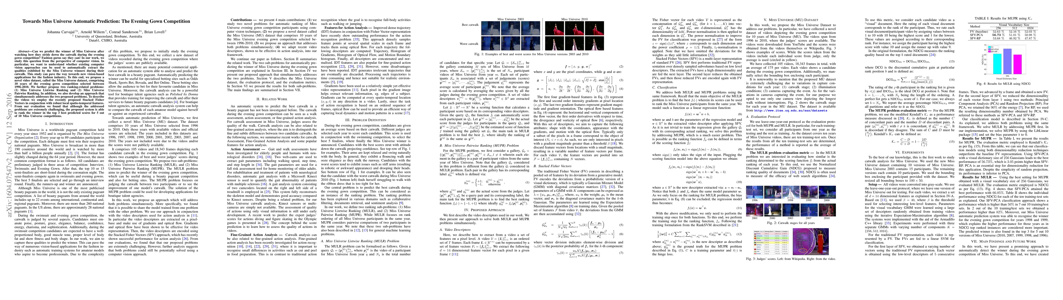 Researchers propose a computer vision approach to predict Miss Universe winners based on their evening gown catwalks, achieving top 3 predictions for 5 out of 10 competitions.