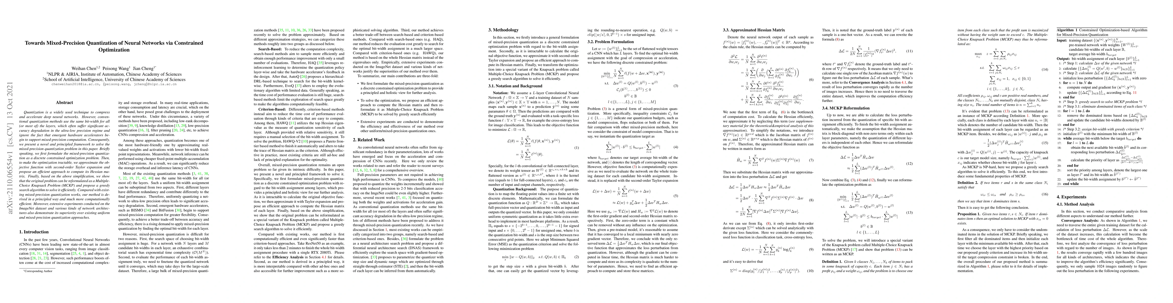This paper presents a novel framework for mixed-precision quantization of neural networks, formulated as a constrained optimization problem. It employs a second-order Taylor expansion and a greedy search algorithm to efficiently solve the reformulated Multiple-Choice Knapsack Problem, demonstrating superior performance compared to existing methods.